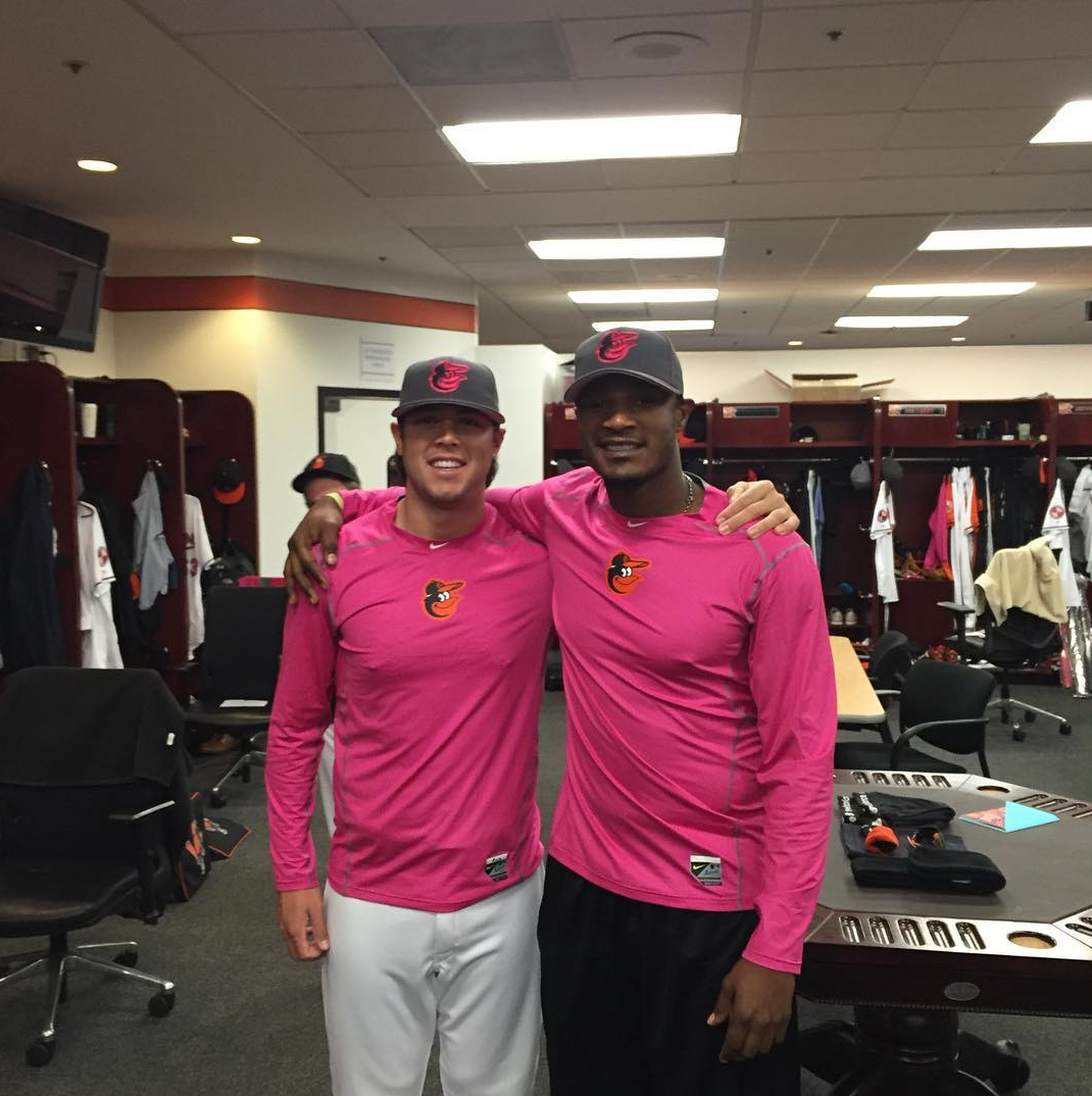 Jones posed in his pink Orioles shirt and cap in honor of Mother’s Day. Major League Baseball supports awareness for breast cancer on the holiday each season.