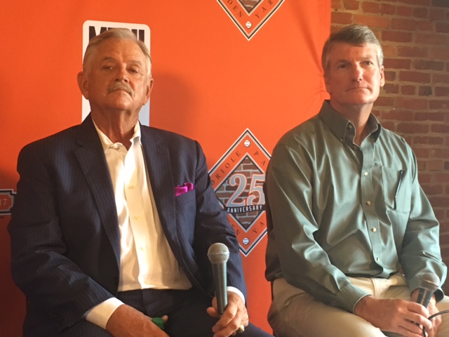 Reliever Mark Williamson (at right, Rick Dempsey is at left) on the unique placement of the double-decked bullpen in left-center field: “We had a great view of everything. You could actually see what hitters were doing throughout the course of a game. So that if you knew that odds are that you’re gonna come in and see whatever person you were gonna have to face, you could actually see the game, which was a novel concept. You were real close to the fans, and the fans could sit there and were probably like, seeing guys warming up, were like, ‘Yeah, I could hit that.’”