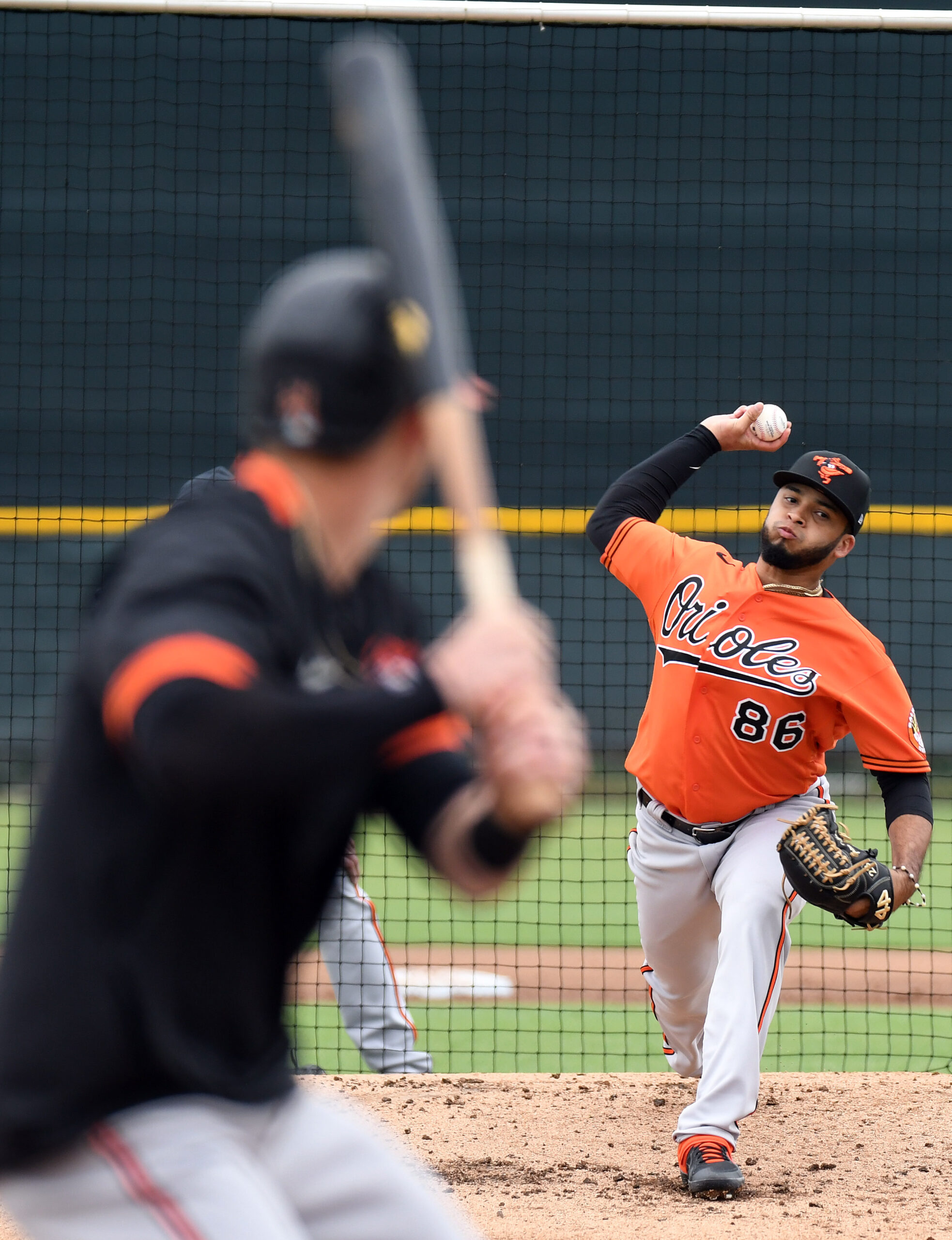 Feb 21, 2020; Sarasota, Florida, USA; Baltimore Orioles pitcher Marcos Diplan (86) pitches during the spring training workout. Mandatory Credit: Jonathan Dyer-USA TODAY Sports