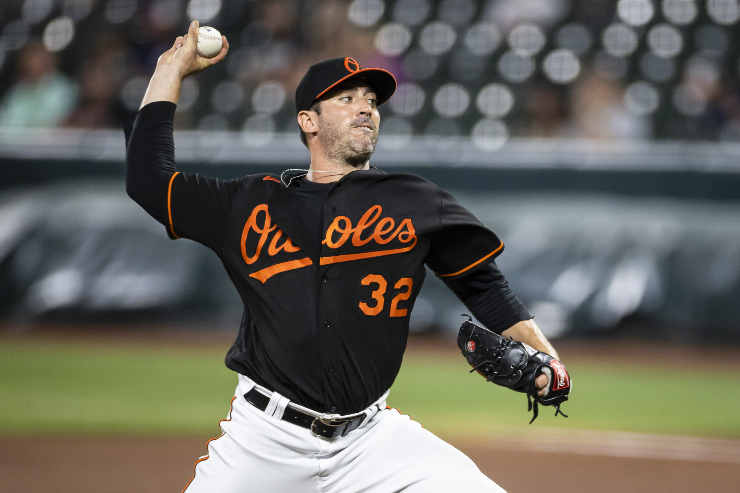 Aug 27, 2021; Baltimore, Maryland, USA; Baltimore Orioles starting pitcher Matt Harvey (32) pitches against the Tampa Bay Rays during the sixth inning at Oriole Park at Camden Yards. Mandatory Credit: Scott Taetsch-USA TODAY Sports