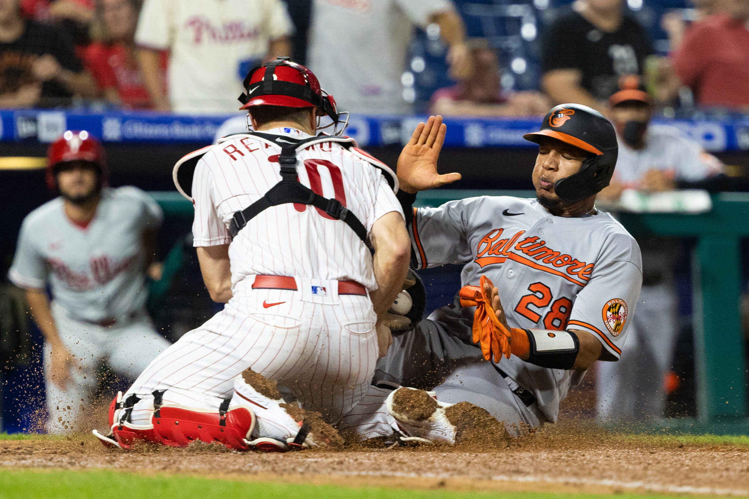 The Orioles (48-104) trailed 4-2 but rallied in the eighth against Cam Bedrosian. Ryan Mountcastle led off with a scorcher that Phillies first baseman Matt Vierling nabbed. Austin Hays walked and moved to second on a passed ball by Realmuto. Pedro Severino doubled to score Hays. After Ryan McKenna struck out, Pat Valaika singled to right and third base coach Tony Mansolino waved Severino home, but Bryce Harper’s throw easily beat Severino and Philadelphia (78-74) led, 4-3.