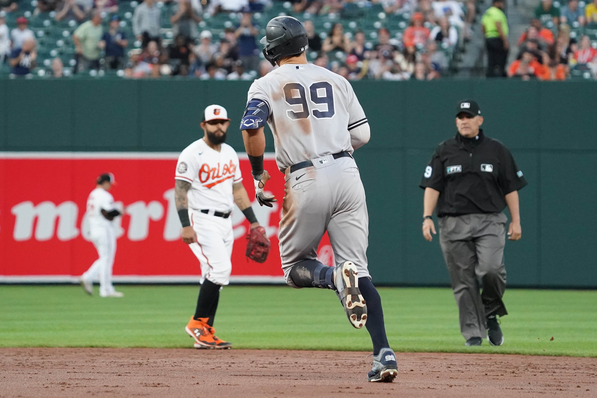 Oriole starter Spenser Watkins hit DJ LeMahieu with a pitch to begin the game. Judge hit a ball high off the left-field wall. LeMahieu scored, and Judge was thrown out after oversliding third base.