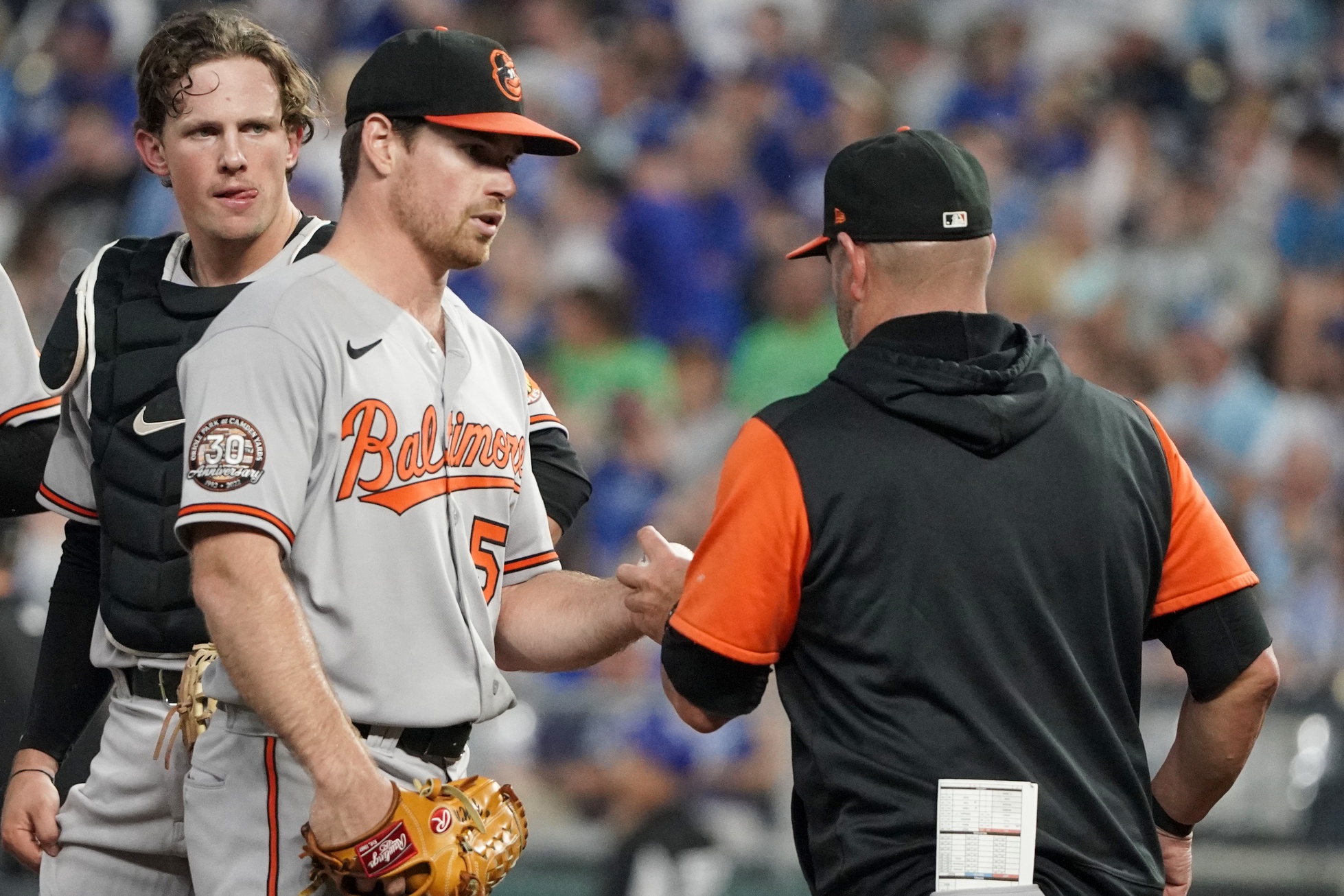 Jun 10, 2022; Kansas City, Missouri, USA; Baltimore Orioles starting pitcher Bruce Zimmermann (50) hands the ball to manager Brandon Hyde (18) as he is relieved against the Kansas City Royals in the fifth inning at Kauffman Stadium. Mandatory Credit: Denny Medley-USA TODAY Sports