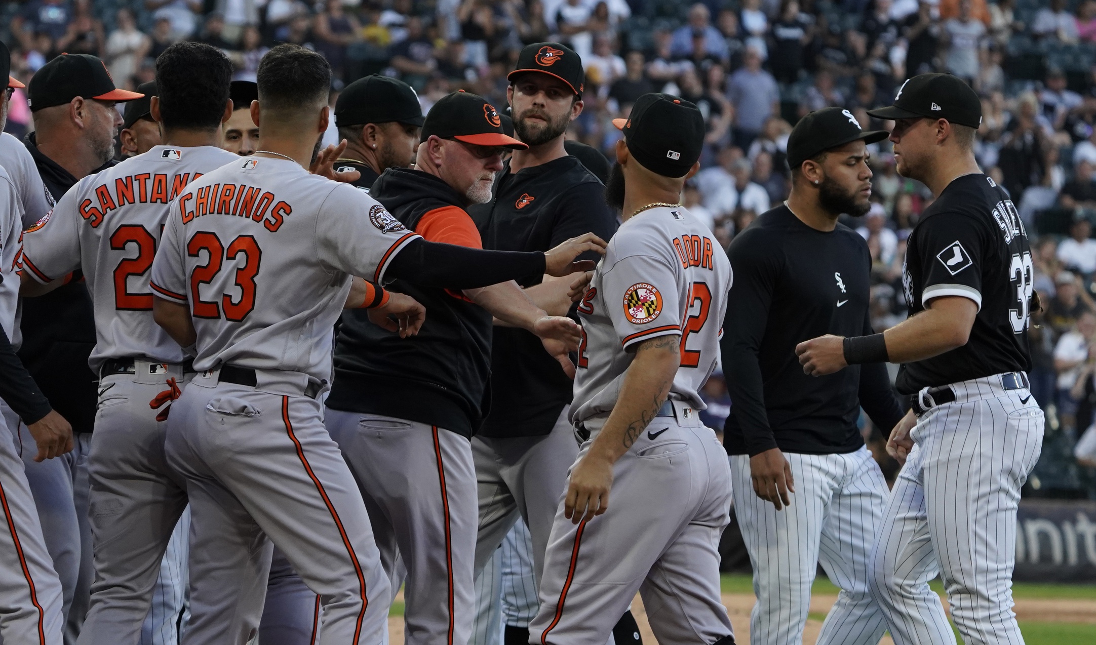 Jun 24, 2022; Chicago, Illinois, USA; The Baltimore Orioles and Chicago White Sox benches clear after a player was hit by a pitch during the second inning at Guaranteed Rate Field. Mandatory Credit: David Banks-USA TODAY Sports