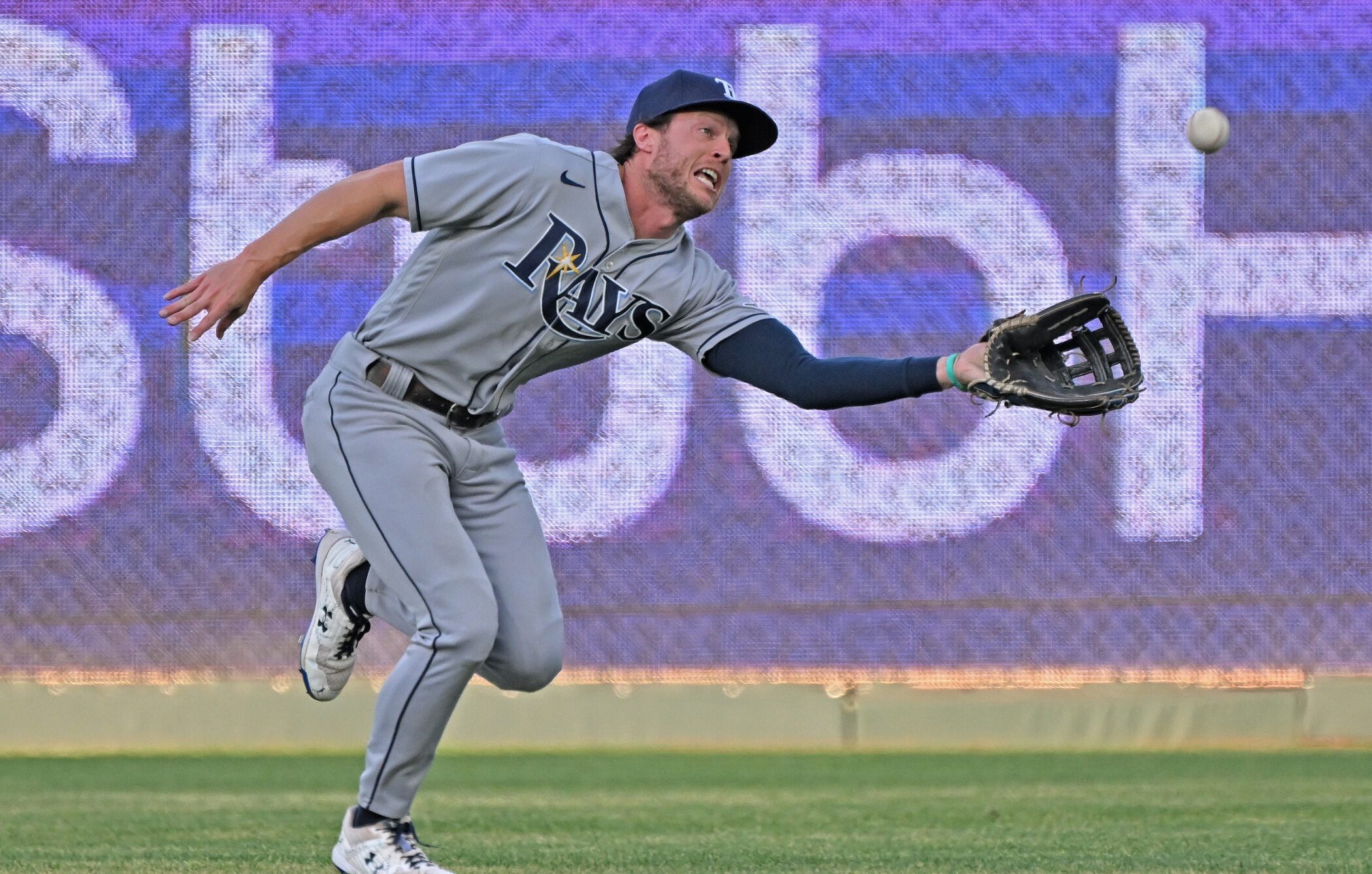 Jul 22, 2022; Kansas City, Missouri, USA; Tampa Bay Rays center fielder Brett Phillips (35) reaches to make a running catch during the first inning against the Kansas City Royals at Kauffman Stadium. Mandatory Credit: