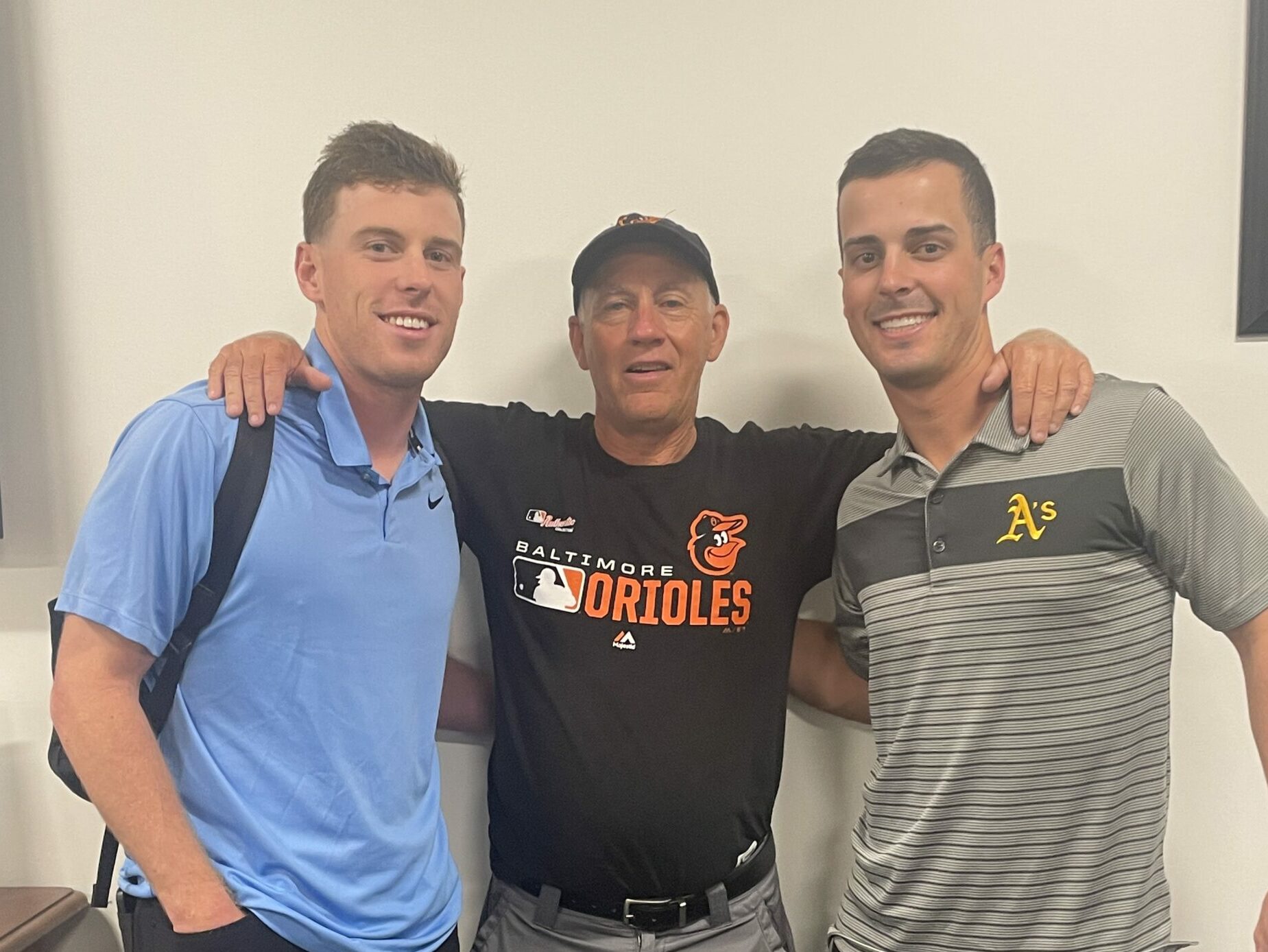At the trade deadline, JP was sent to Oakland by the Yankees. When the A’s quickly put JP into the major league rotation, I traveled to Texas to catch one of his starts against the Rangers. I wore my traditional ballpark attire — Orioles shirt and Orioles cap. JP grinded through five innings of scoreless ball to improve to 4-0 on the season. After the game I was invited to the A’s “family” room along with McLendon and JP’s mother, and walked in awkwardly dressed head-to-toe in my Orioles garb.