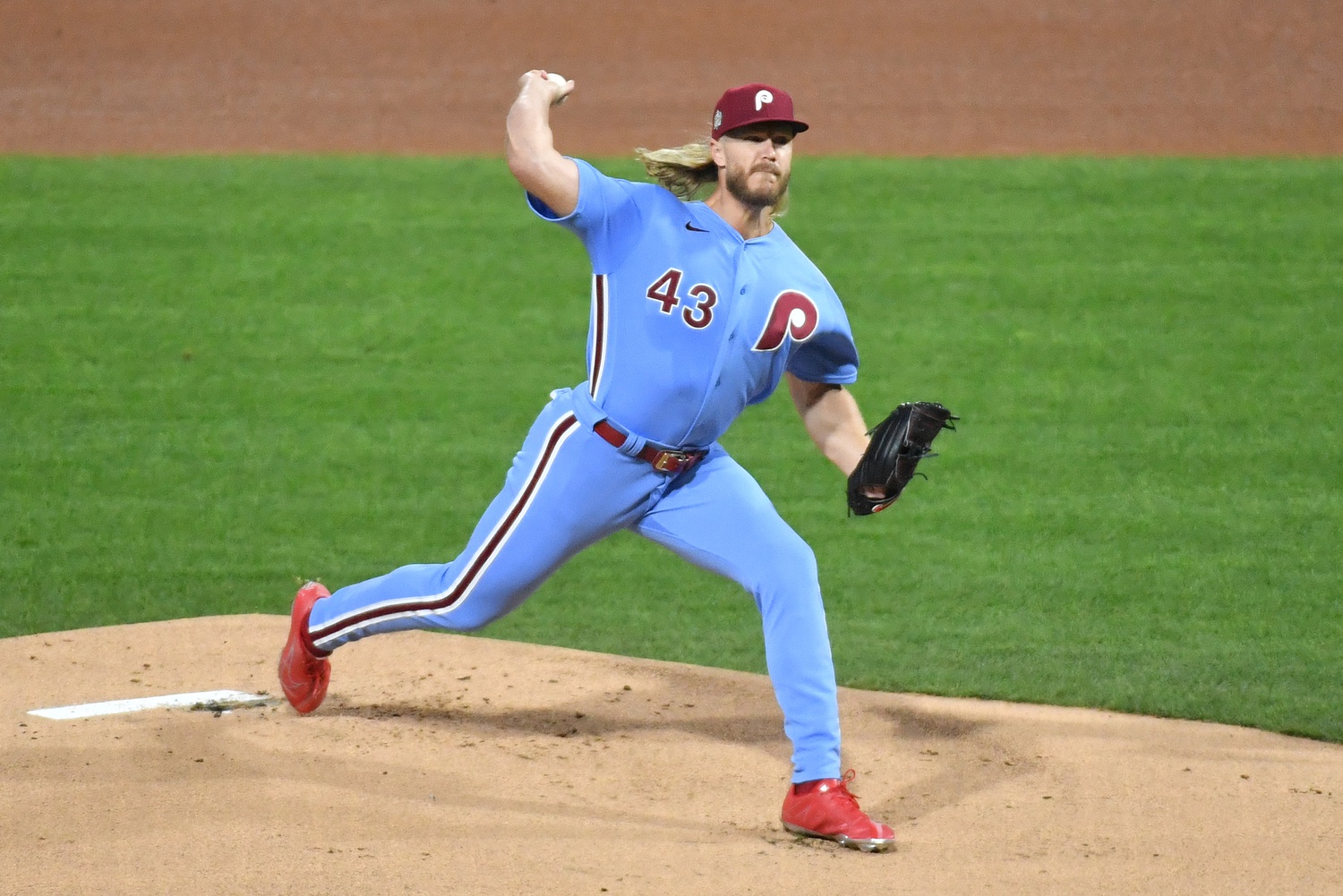 Nov 3, 2022; Philadelphia, Pennsylvania, USA; Philadelphia Phillies starting pitcher Noah Syndergaard (43) pitches against the Houston Astros during the first inning during game five of the 2022 World Series at Citizens Bank Park. Mandatory Credit: Eric Hartline-USA TODAY Sports