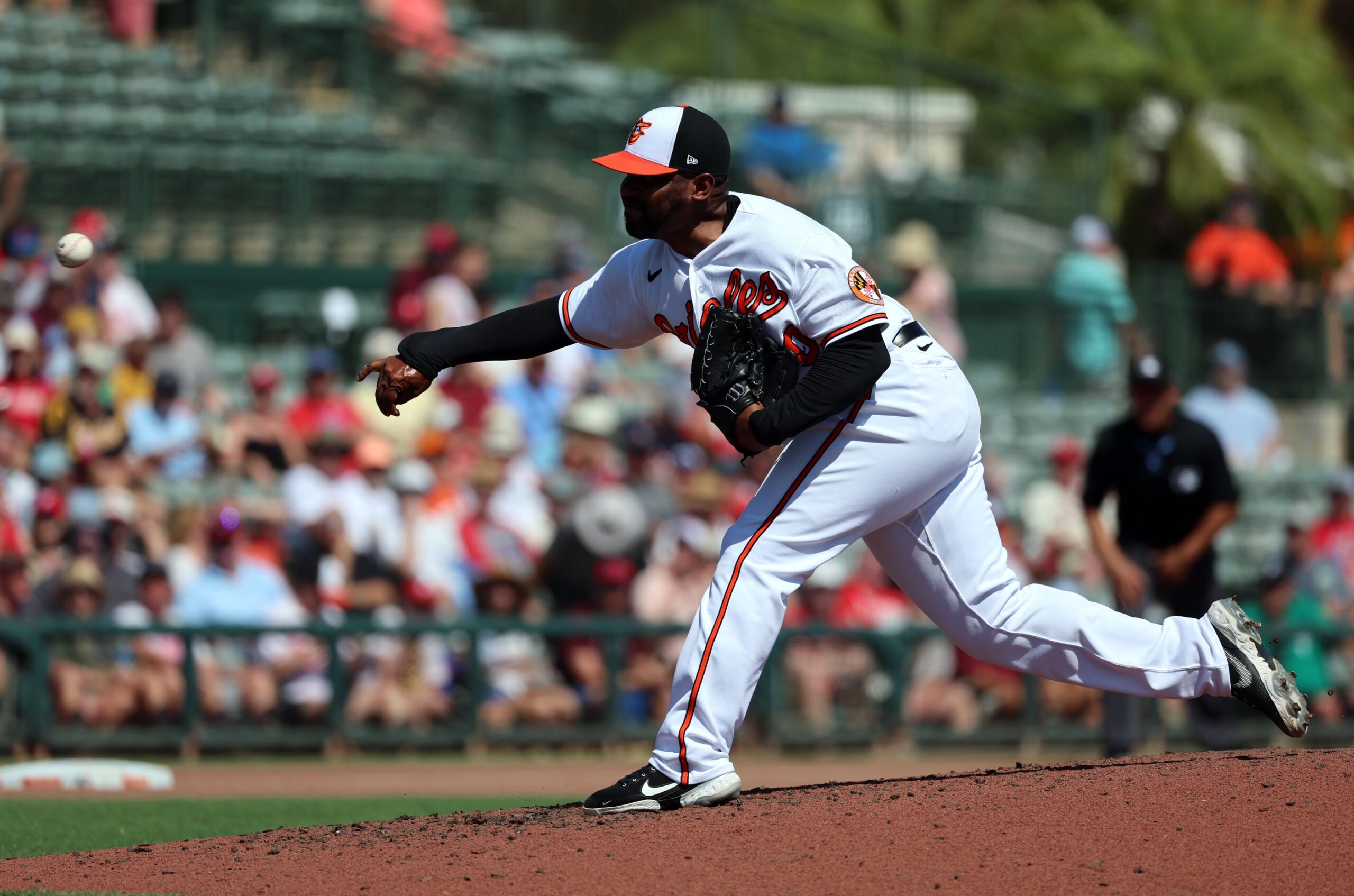 Mar 6, 2023; Sarasota, Florida, USA; Baltimore Orioles relief pitcher Mychal Givens (60) throws a pitch during the fourth inning against the Philadelphia Phillies at Ed Smith Stadium. Mandatory Credit: Kim Klement-USA TODAY Sports