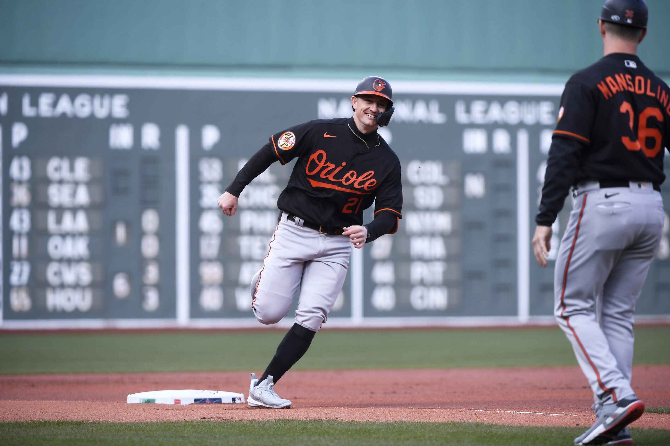 Apr 1, 2023; Boston, Massachusetts, USA; Baltimore Orioles right fielder Austin Hays (21) rounds third base after hitting a home run during the first inning against the Boston Red Sox at Fenway Park. Mandatory Credit: Bob DeChiara-USA TODAY Sports