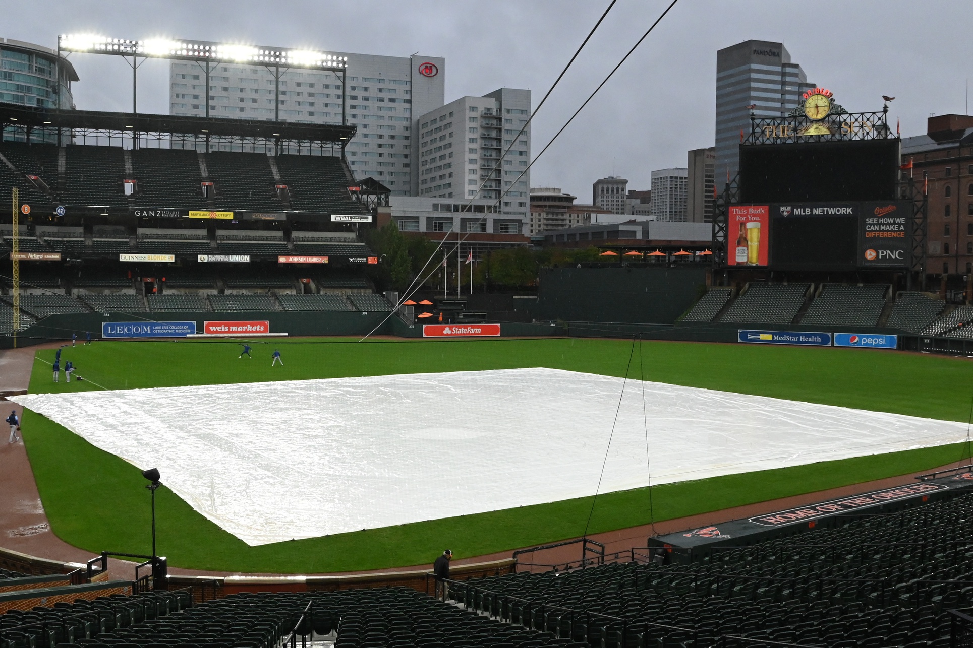Oct 4, 2022; Baltimore, Maryland, USA; The game between the Baltimore Orioles and the Toronto Blue Jays was postponed dude inclement weather at Oriole Park at Camden Yards. Mandatory Credit: Tommy Gilligan-USA TODAY Sports