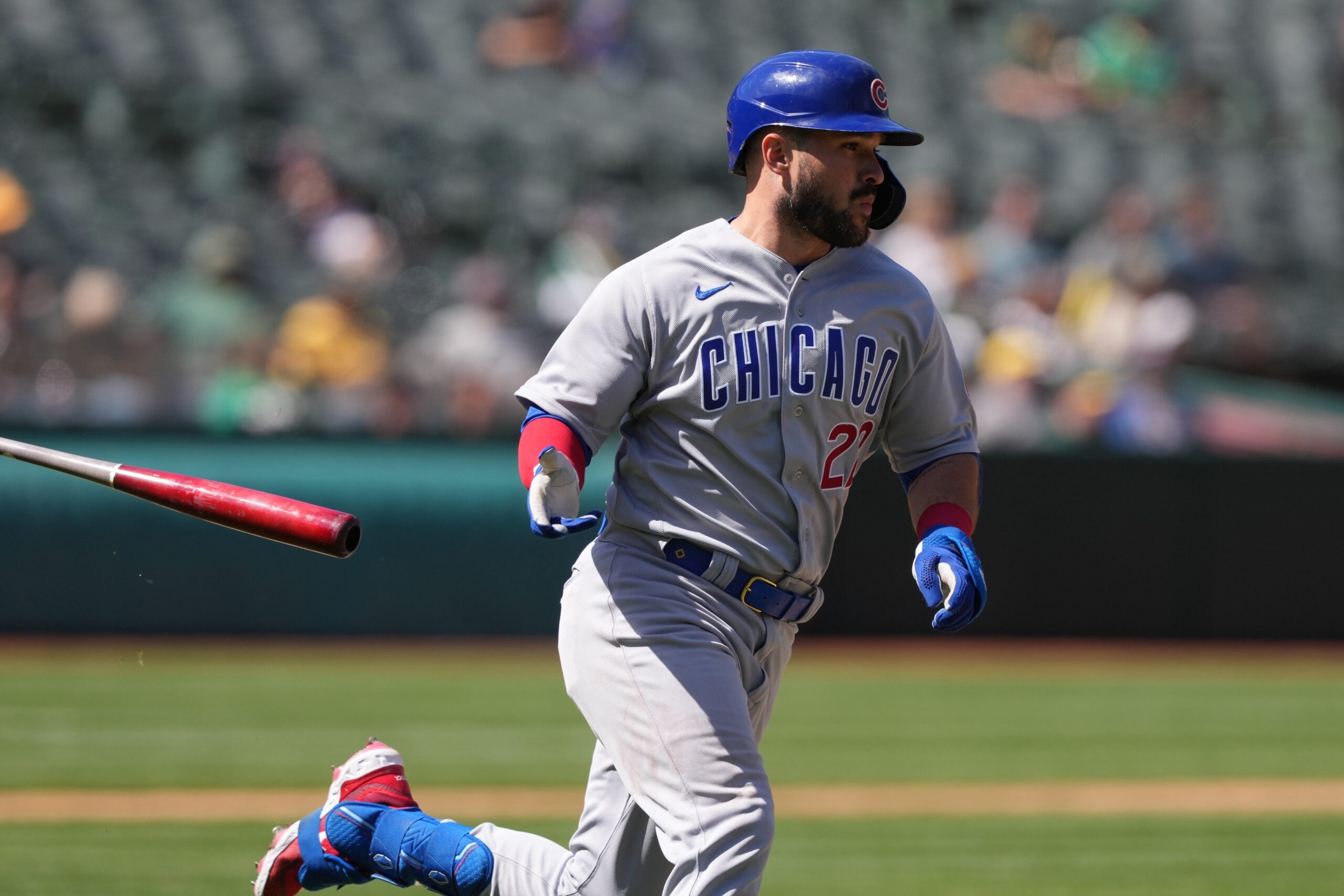 Apr 19, 2023; Oakland, California, USA; Chicago Cubs catcher Luis Torrens (22) tosses his bat while running to first base after hitting an RBI-double against the Oakland Athletics during the ninth inning at Oakland-Alameda County Coliseum. Mandatory Credit: Darren Yamashita-USA TODAY Sports