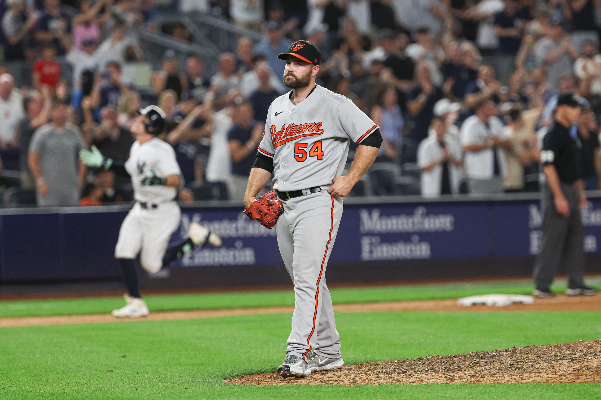 Jul 3, 2023; Bronx, New York, USA; Baltimore Orioles relief pitcher Danny Coulombe (54) reacts after allowing a three run home run to New York Yankees center fielder Harrison Bader (22) during the eighth inning at Yankee Stadium. Mandatory Credit: Vincent Carchietta-USA TODAY Sports