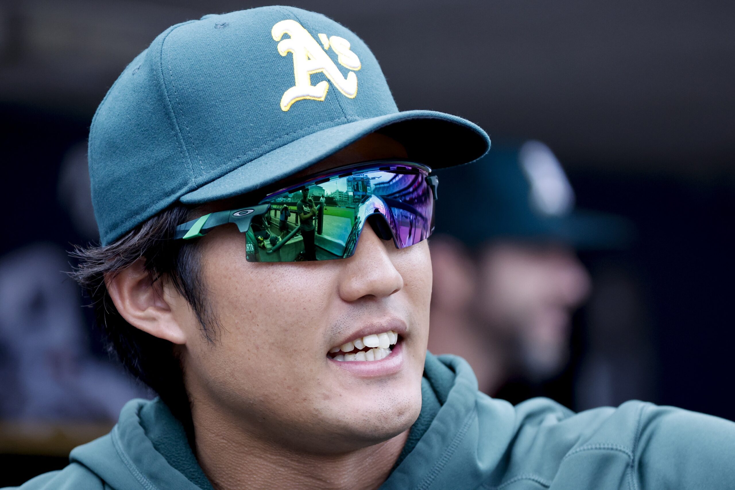 Jul 6, 2023; Detroit, Michigan, USA; Oakland Athletics relief pitcher Shintaro Fujinami (11) in the dugout in the first inning against the Detroit Tigers at Comerica Park. Mandatory Credit: Rick Osentoski-USA TODAY Sports