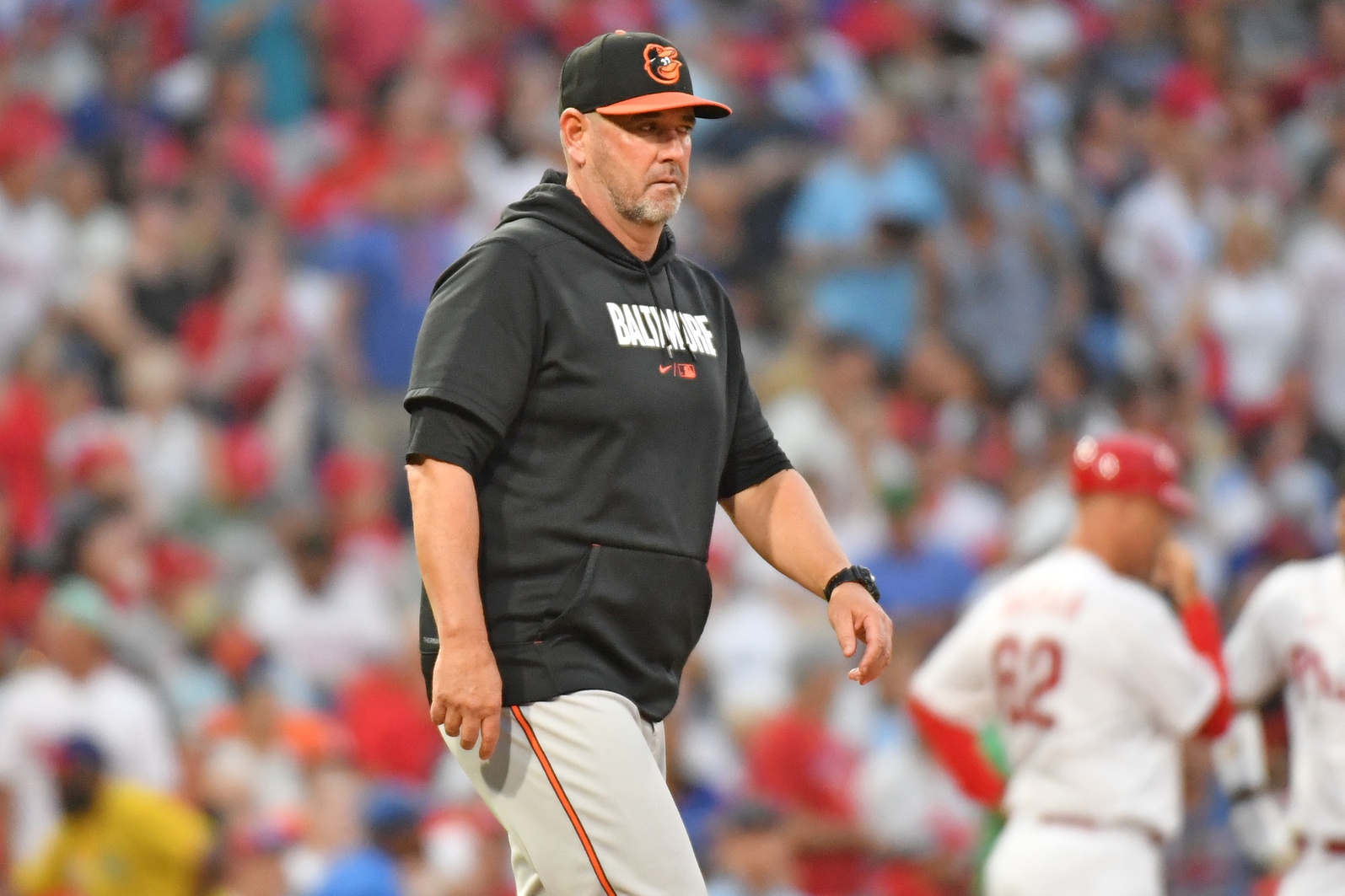 Jul 26, 2023; Philadelphia, Pennsylvania, USA; Baltimore Orioles manager Brandon Hyde (18) walks to the pitchers mound against the Philadelphia Phillies during the seventh inning at Citizens Bank Park. Mandatory Credit: Eric Hartline-USA TODAY Sports