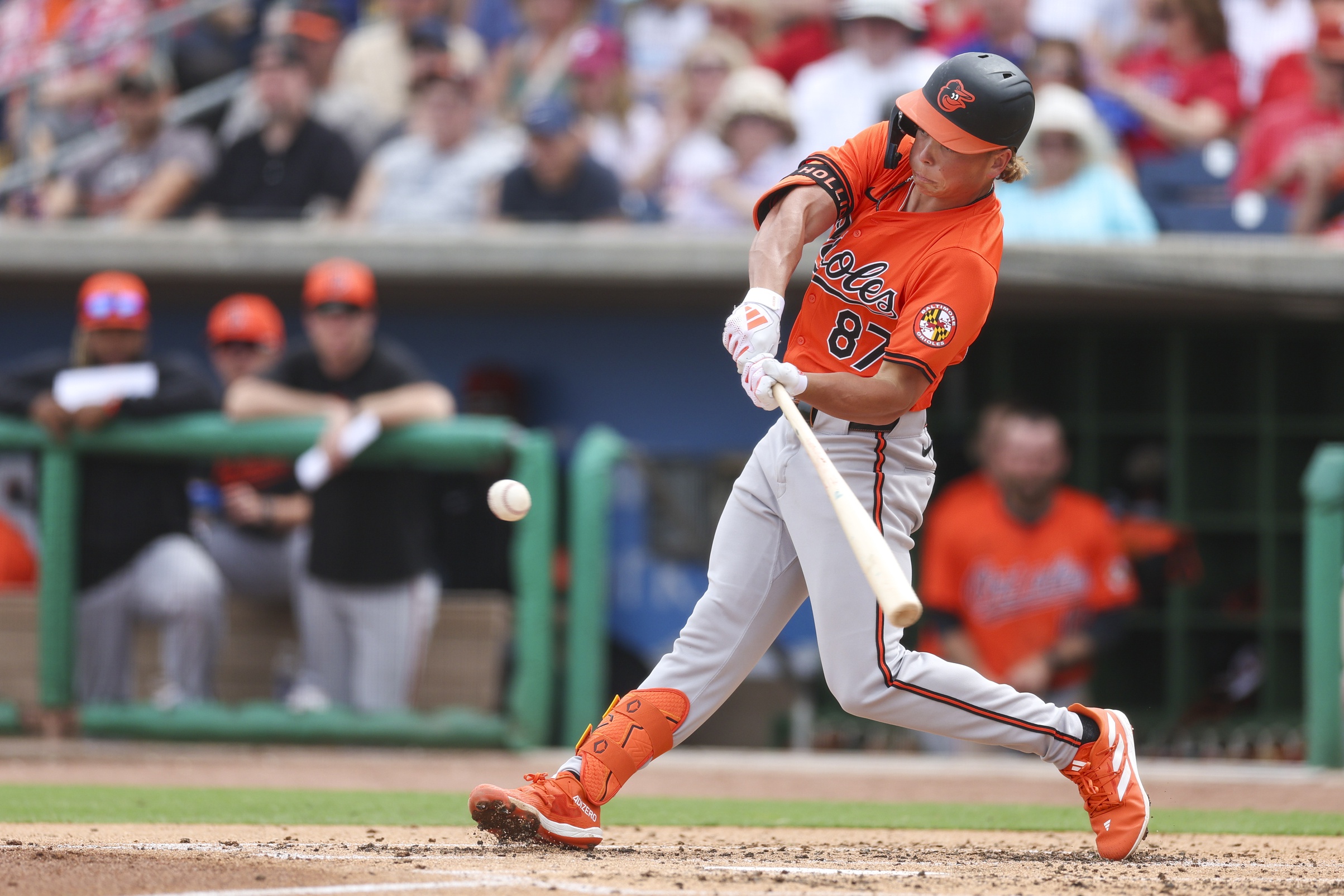 Mar 5, 2024; Clearwater, Florida, USA; Baltimore Orioles shortstop Jackson Holliday (87) hits a triple against the Philadelphia Phillies in the third inning at BayCare Ballpark. Mandatory Credit: Nathan Ray Seebeck-USA TODAY Sports