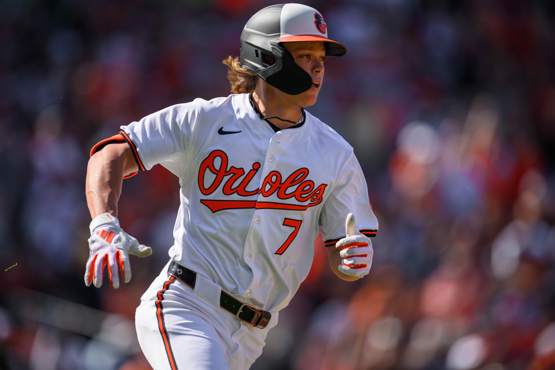 Apr 14, 2024; Baltimore, Maryland, USA; Baltimore Orioles second base Jackson Holliday (7) runs to first base after hitting a single during the seventh inning against the Milwaukee Brewers at Oriole Park at Camden Yards. Mandatory Credit: Reggie Hildred-USA TODAY Sports