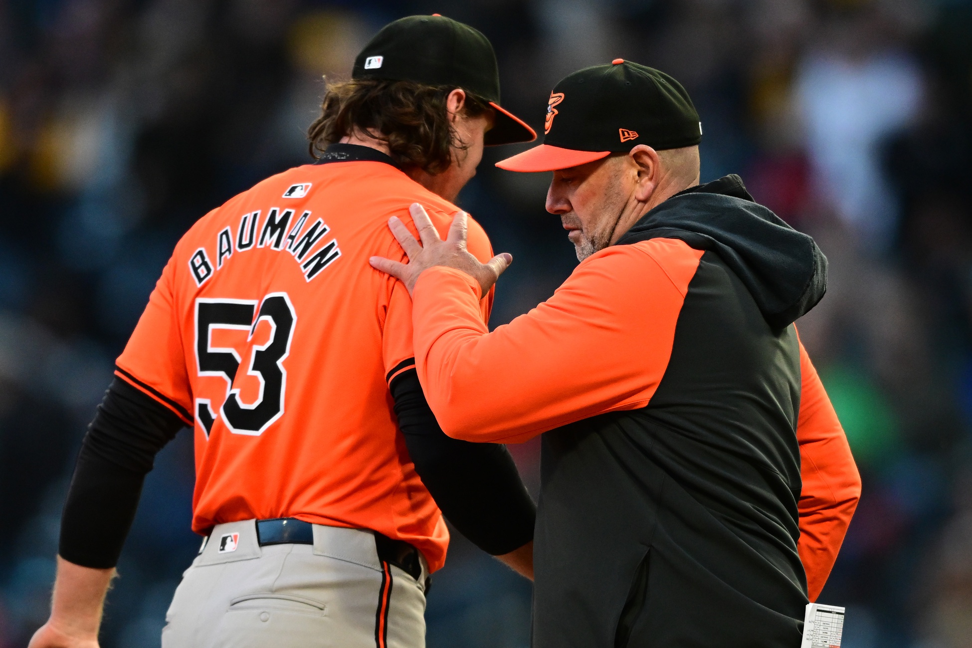 Apr 6, 2024; Pittsburgh, Pennsylvania, USA; Baltimore Orioles manager Brandon Hyde (18) removes relief pitcher Mike Baumann (53) from the game during the tenth inning against the Pittsburgh Pirates at PNC Park. Mandatory Credit: David Dermer-USA TODAY Sports