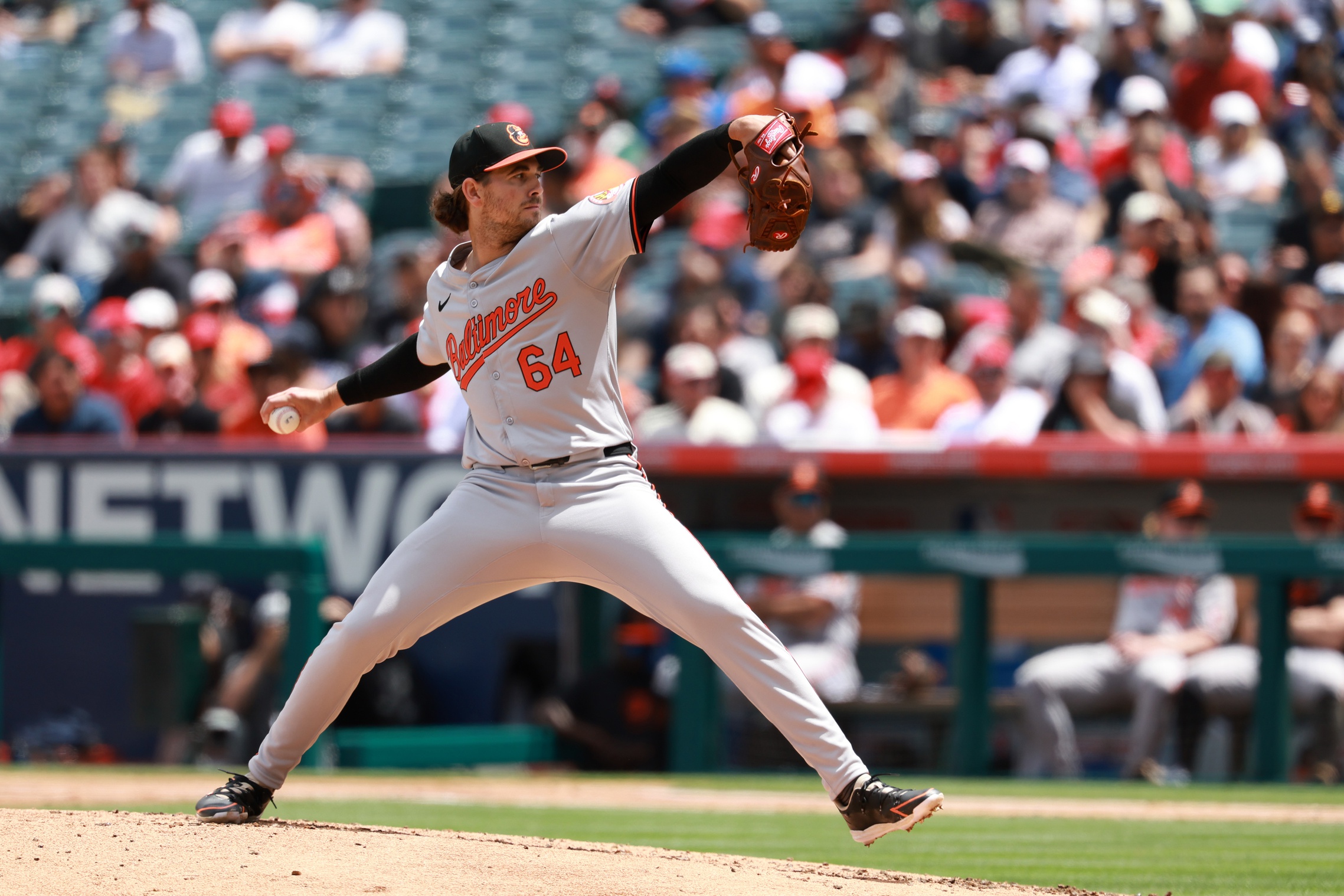 Apr 24, 2024; Anaheim, California, USA; Baltimore Orioles pitcher Dean Kremer (64) pitches during the second inning against the Los Angeles Angels at Angel Stadium. Mandatory Credit: Kiyoshi Mio-USA TODAY Sports