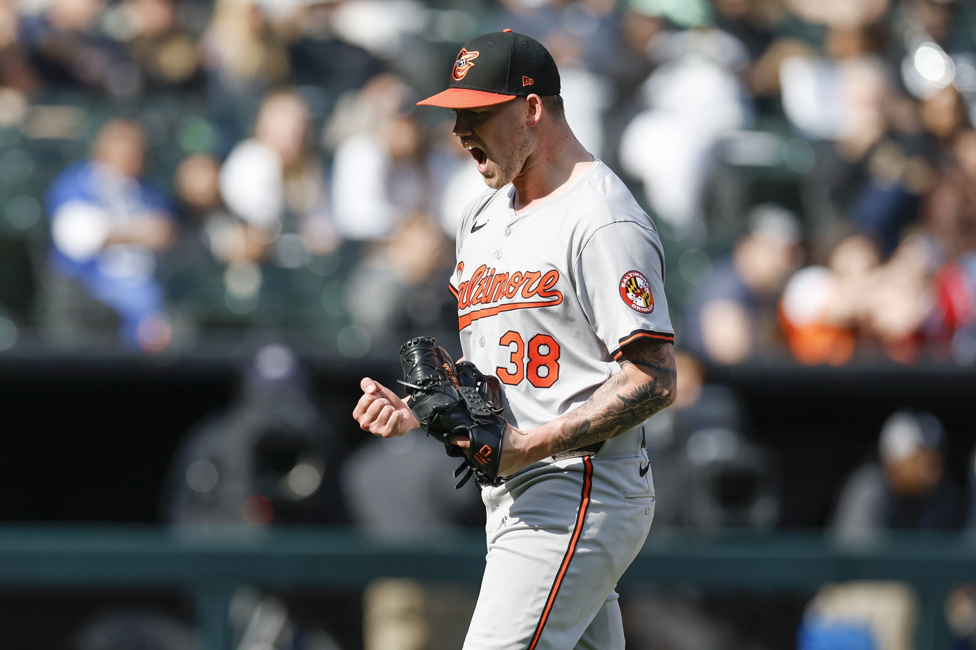 May 26, 2024; Chicago, Illinois, USA; Baltimore Orioles starting pitcher Kyle Bradish (38) reacts after striking out Chicago White Sox third baseman Bryan Ramos during the seventh inning at Guaranteed Rate Field. Mandatory Credit: Kamil Krzaczynski-USA TODAY Sports