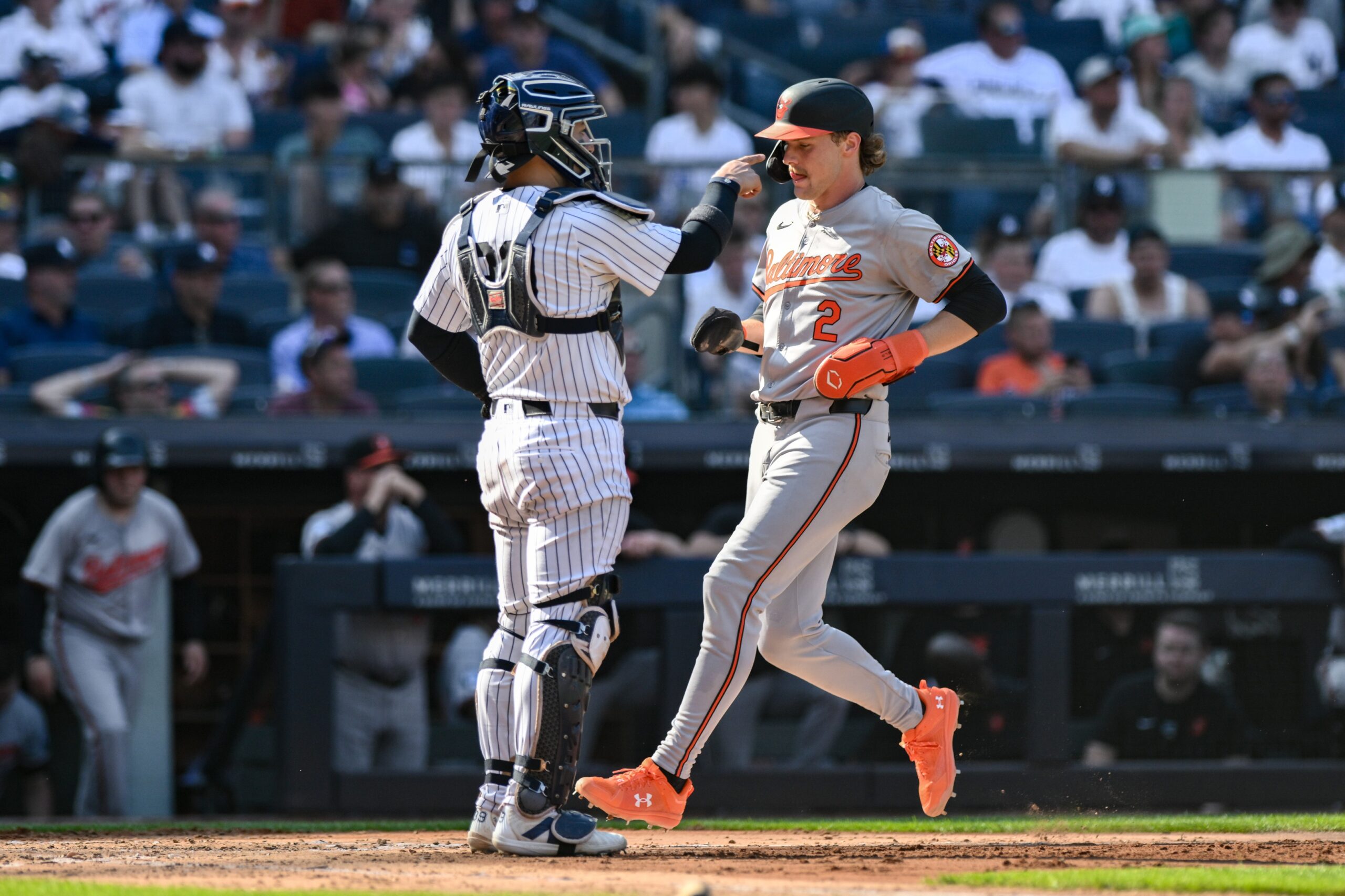 Jun 20, 2024; Bronx, New York, USA; Baltimore Orioles shortstop Gunnar Henderson (2) scores a run on a sacrifice fly by first baseman Ryan O'Hearn (not pictured) during the third inning against the New York Yankees at Yankee Stadium. Mandatory Credit: John Jones-USA TODAY Sports