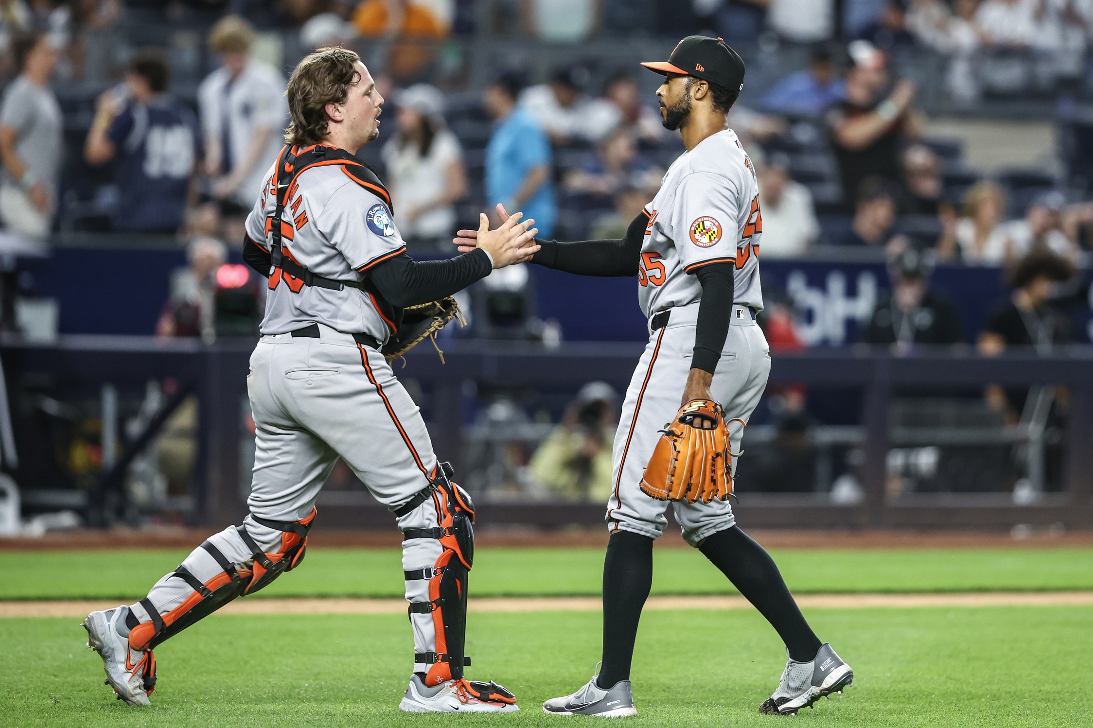 Jun 19, 2024; Bronx, New York, USA; Baltimore Orioles catcher Adley Rutschman (35) congratulates relief pitcher Dillon Tate (55) after recording a save to defeat the New York Yankees 7-6 in ten innings at Yankee Stadium. Mandatory Credit: Wendell Cruz-USA TODAY Sports