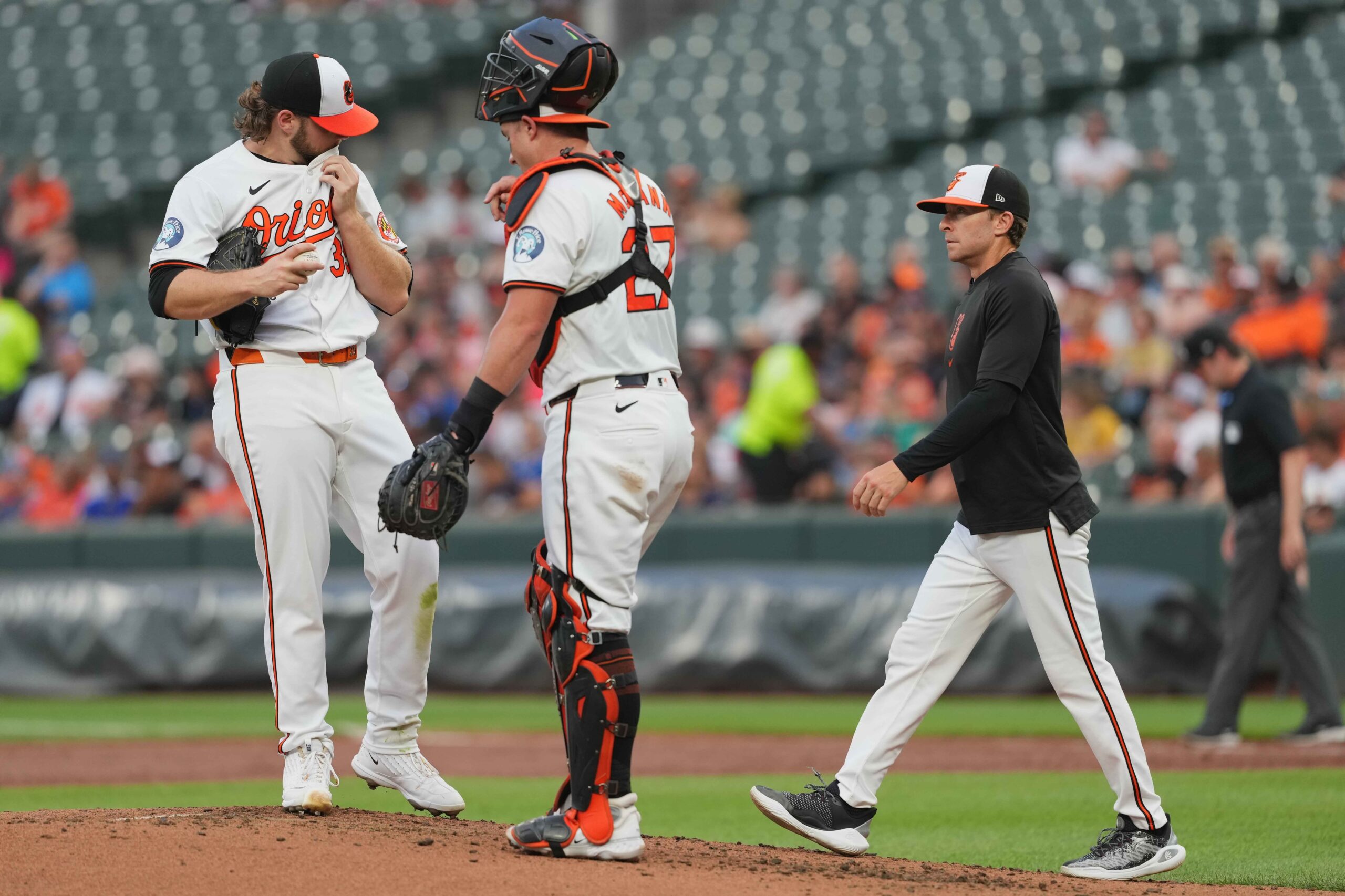 Jul 10, 2024; Baltimore, Maryland, USA; Baltimore Orioles pitcher Corbin Burnes (39) is joined by catcher James McCann (center) and pitching coach Drew French (right) during the second inning against the Chicago Cubs at Oriole Park at Camden Yards. Mandatory Credit: Mitch Stringer-USA TODAY Sports