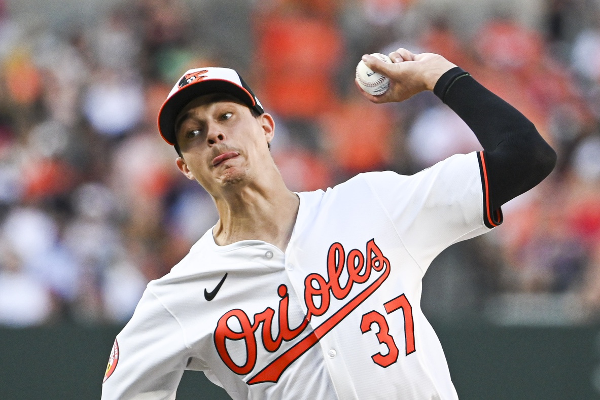 Jun 24, 2024; Baltimore, Maryland, USA; Baltimore Orioles pitcher Cade Povich (37) throws a third inning pitch against the Cleveland Guardians at Oriole Park at Camden Yards. Mandatory Credit: Tommy Gilligan-USA TODAY Sports