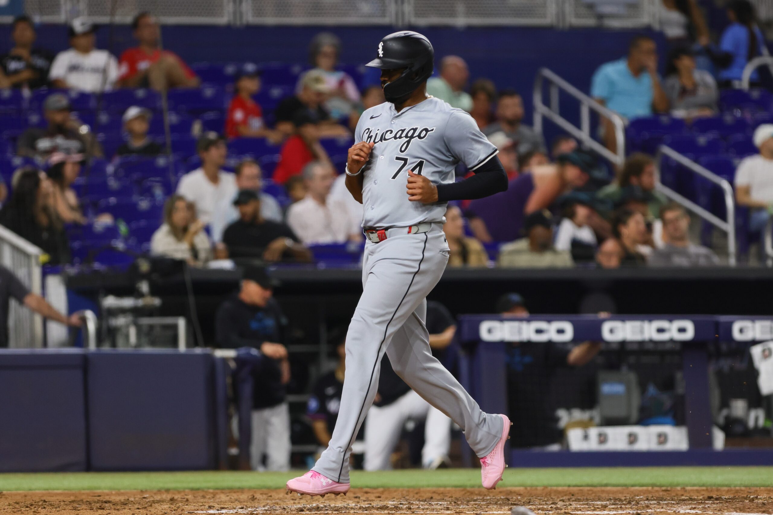 Jul 5, 2024; Miami, Florida, USA; Chicago White Sox designated hitter Eloy Jimenez (74) scores against the Miami Marlins during the fifth inning at loanDepot Park. Mandatory Credit: Sam Navarro-USA TODAY Sports