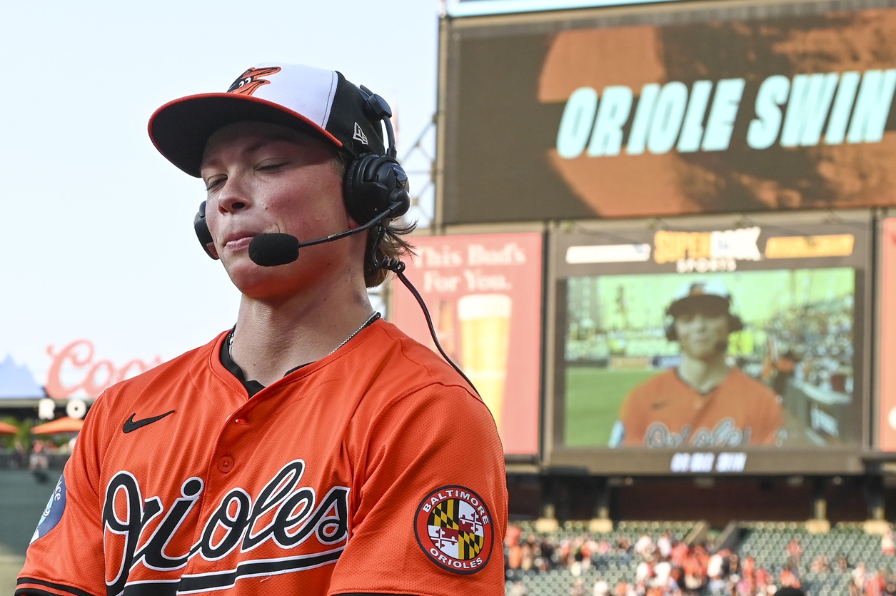 Aug 24, 2024; Baltimore, Maryland, USA; Baltimore Orioles second baseman Jackson Holliday (7) reacts during a post game interview after defeating against the Houston Astros at Oriole Park at Camden Yards. Mandatory Credit: Tommy Gilligan-USA TODAY Sports