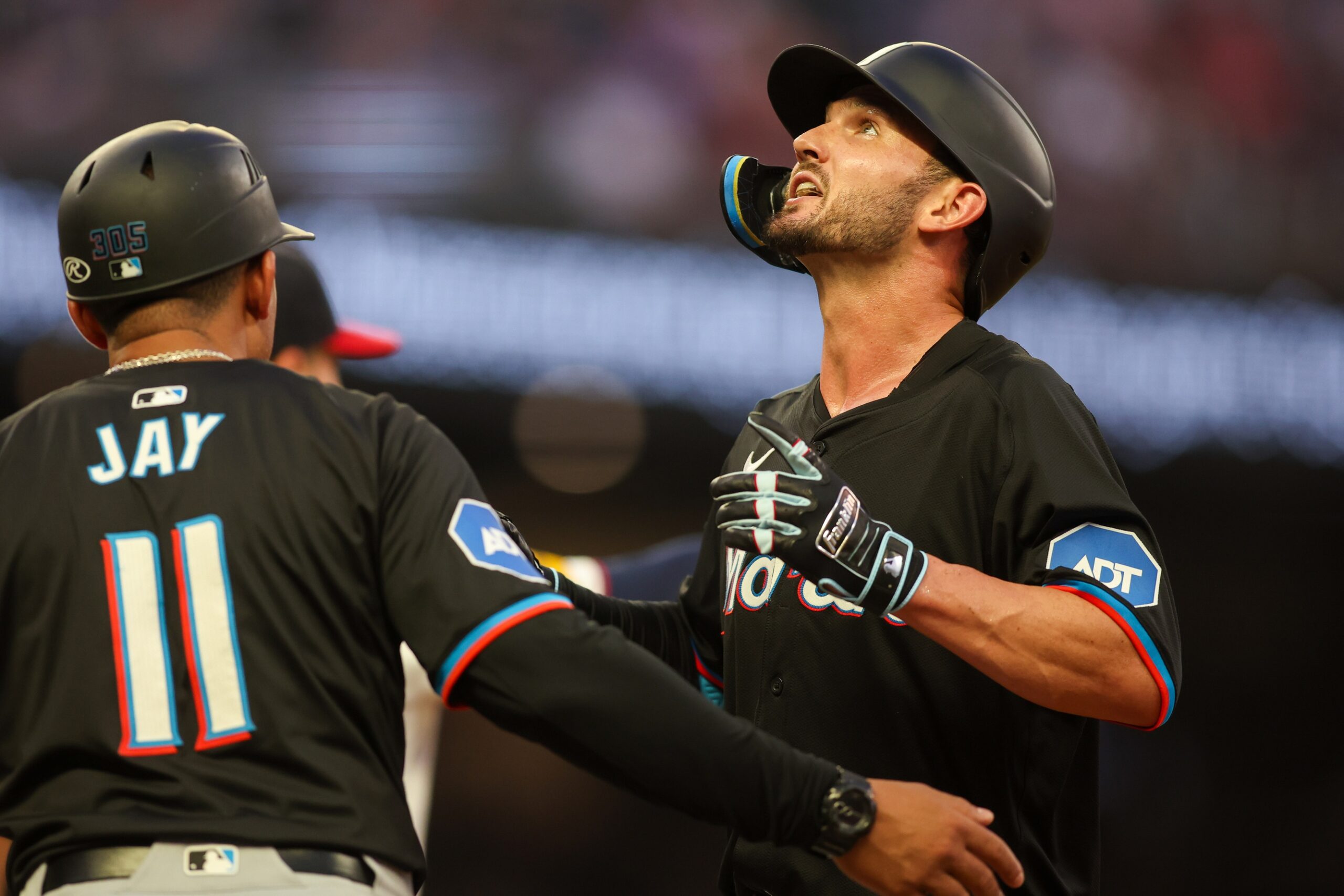 Aug 1, 2024; Atlanta, Georgia, USA; Miami Marlins right fielder Forrest Wall (19) reacts after a single against the Atlanta Braves in the fifth inning at Truist Park. Mandatory Credit: Brett Davis-USA TODAY Sports