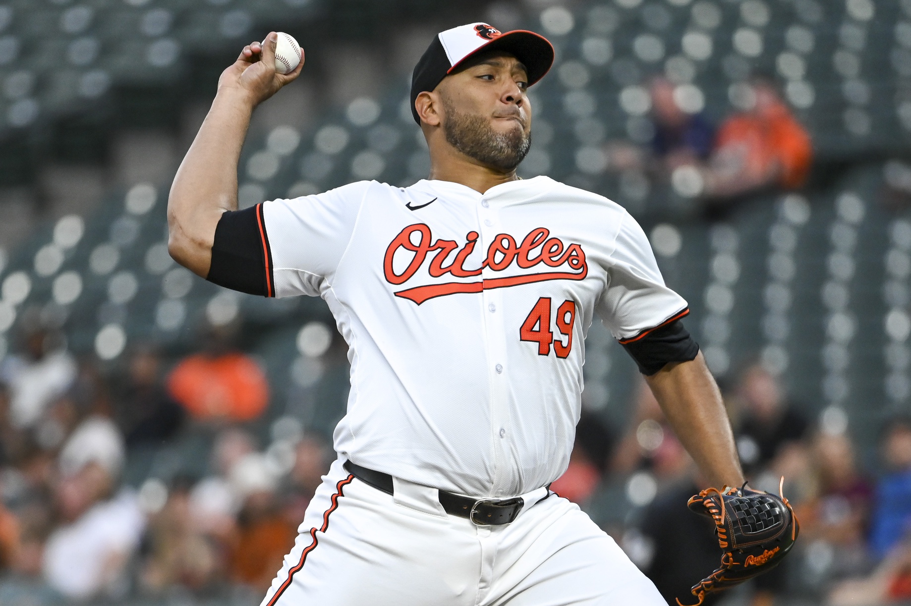 Sep 4, 2024; Baltimore, Maryland, USA; Baltimore Orioles pitcher Albert Surez (49) throws a third inning pitch against the Chicago White Sox at Oriole Park at Camden Yards. Mandatory Credit: Tommy Gilligan -Imagn Images