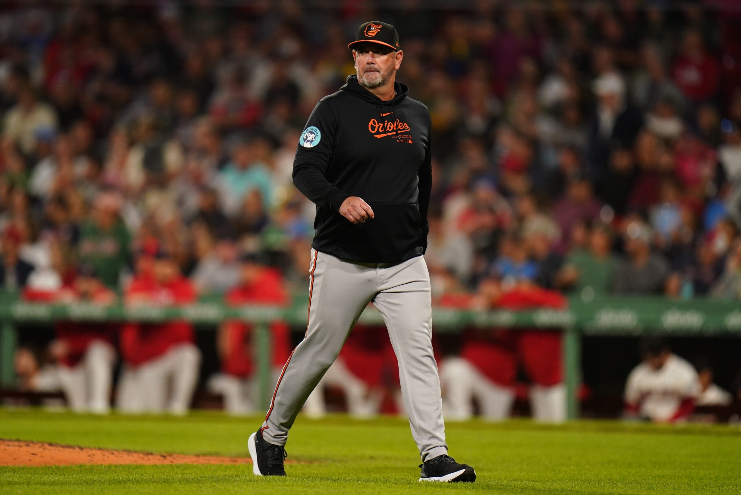 Sep 9, 2024; Boston, Massachusetts, USA; Baltimore Orioles manager Brandon Hyde (18) heads back to the dugout after replacing pitchers against the Boston Red Sox in the sixth inning at Fenway Park. Mandatory Credit: David Butler II-Imagn Images