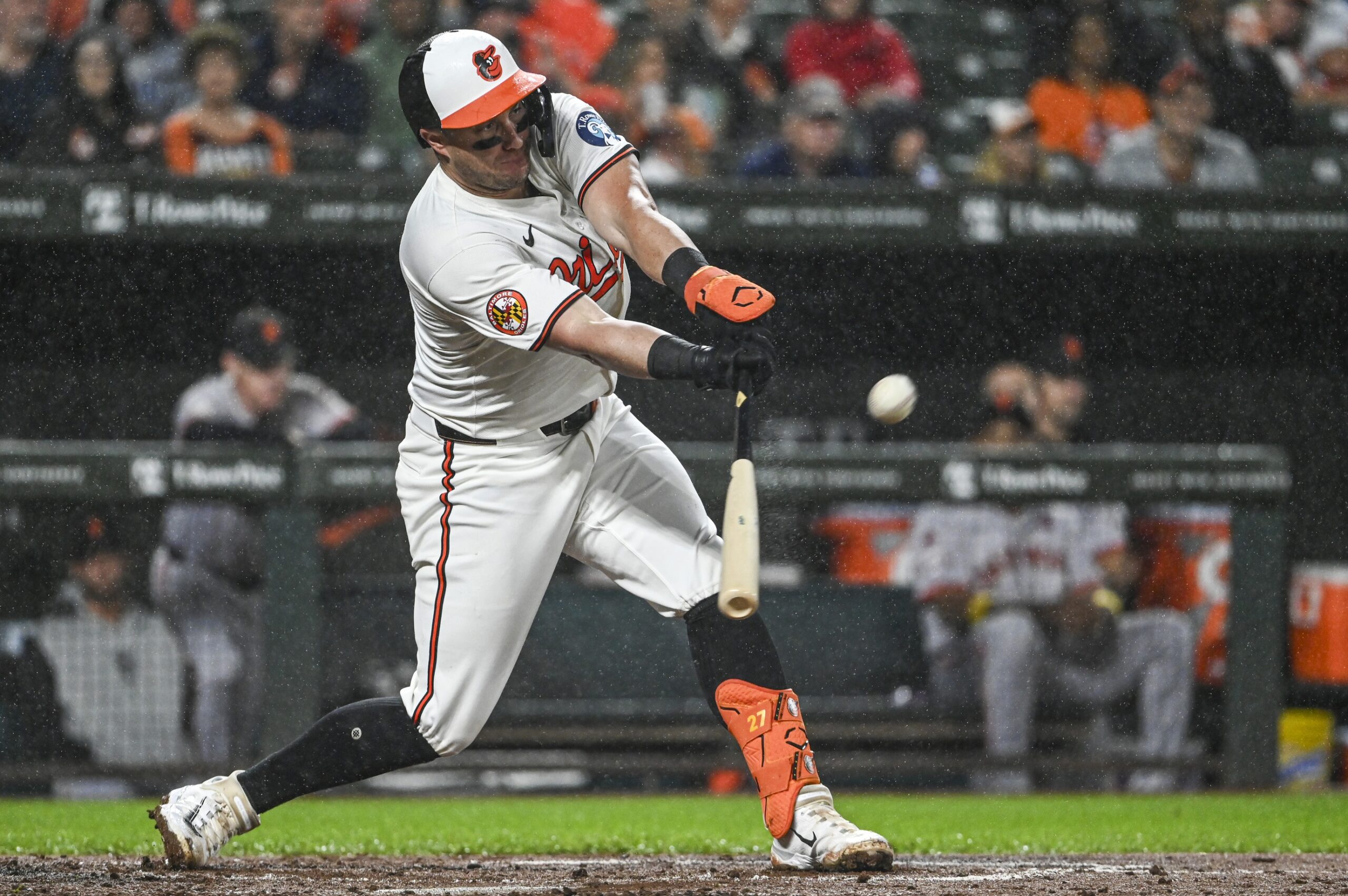 Sep 18, 2024; Baltimore, Maryland, USA; Baltimore Orioles catcher James McCann (27) hits a rbi double in the third inning against the San Francisco Giants at Oriole Park at Camden Yards. Mandatory Credit: Tommy Gilligan-Imagn Images