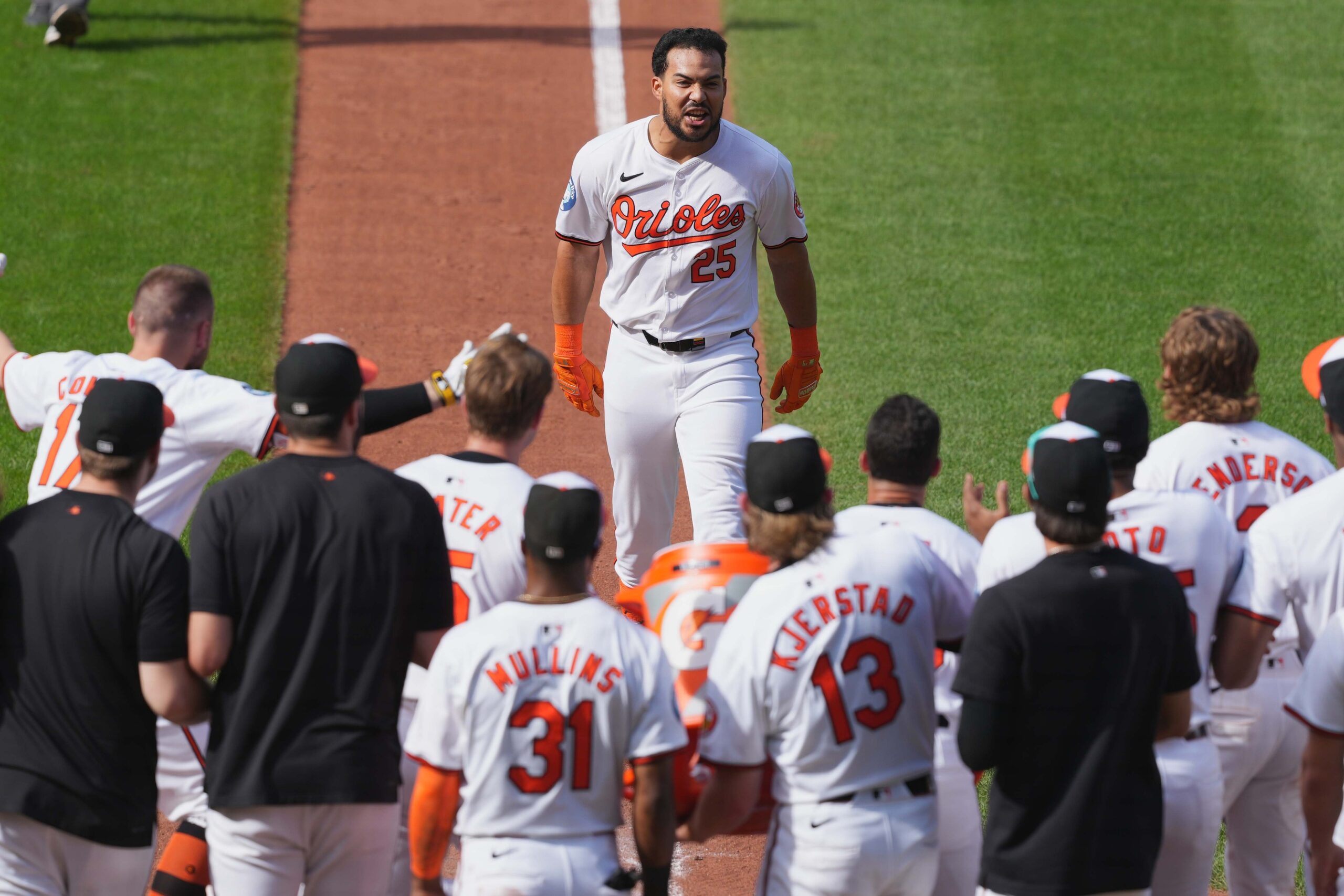 Sep 19, 2024; Baltimore, Maryland, USA; Baltimore Orioles designated hitter Anthony Santander (25) is greeted by teammates following his game winning two run home run in the ninth inning against the San Francisco Giants at Oriole Park at Camden Yards. Mandatory Credit: Mitch Stringer-Imagn Images