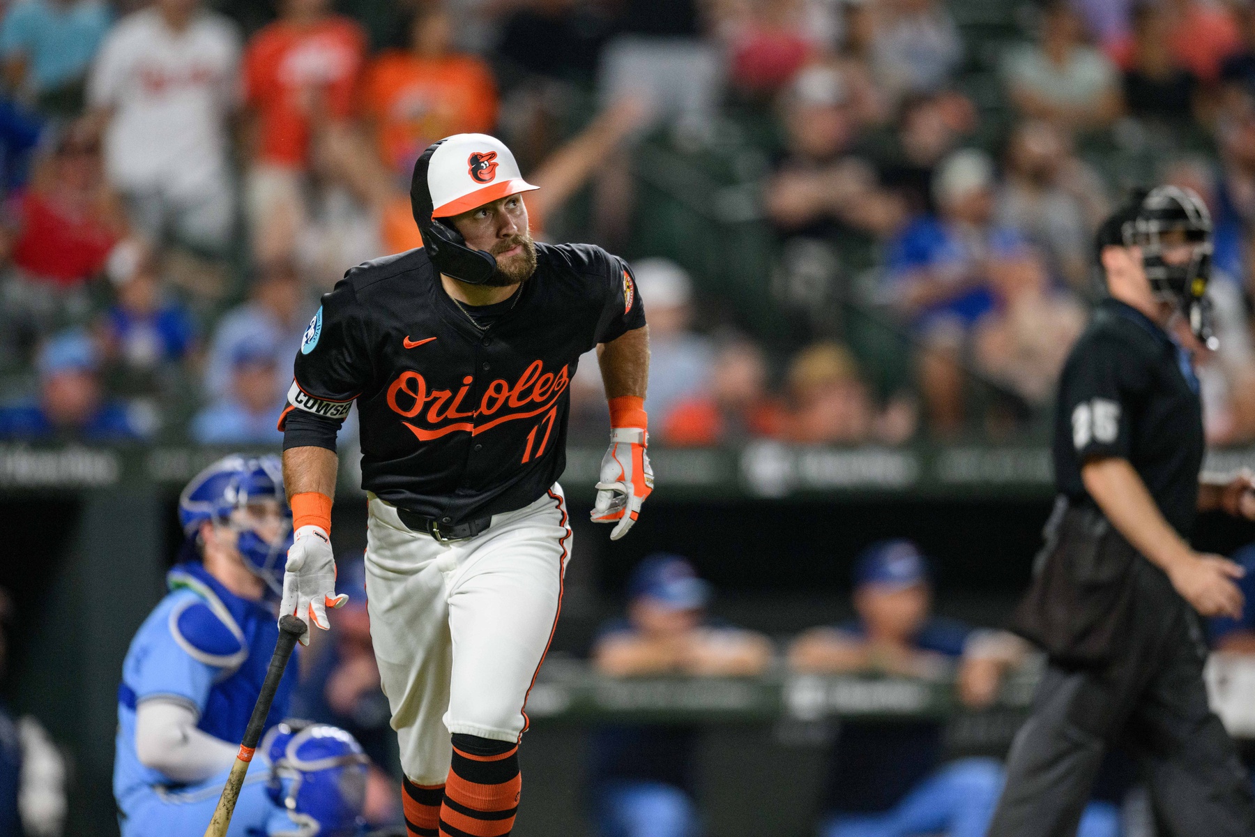 Jul 29, 2024; Baltimore, Maryland, USA; Baltimore Orioles outfielder Colton Cowser (17) reacts after hitting a home run during the first inning against the Toronto Blue Jays at Oriole Park at Camden Yards. Mandatory Credit: Reggie Hildred-USA TODAY Sports