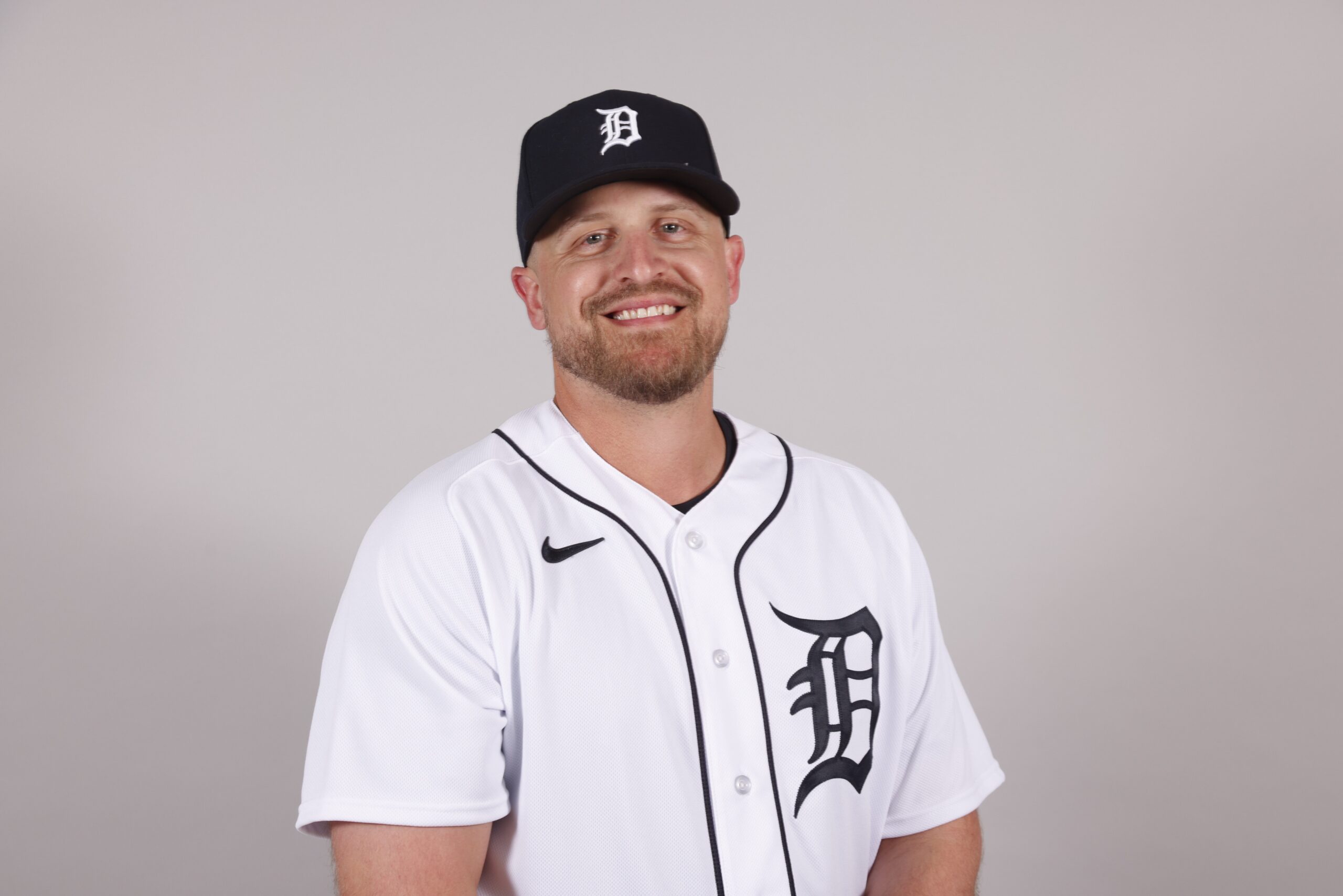 Feb 24, 2023; Lakeland, FL, USA; Detroit Tigers coach Tim Federowicz poses for a photo during the Detroit Tigers media day at Joker Marchant stadium. Mandatory Credit: Reinhold Matay-USA TODAY Sports