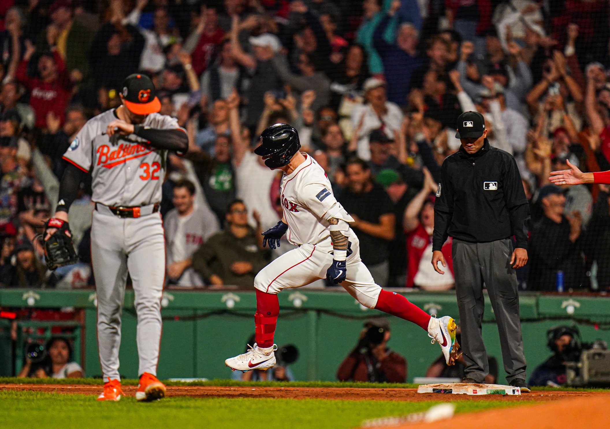Sep 11, 2024; Boston, Massachusetts, USA; Boston Red Sox left fielder Tyler O'Neill (17) his a three run home run to win the game against the Baltimore Orioles in ten innings at Fenway Park. Mandatory Credit: David Butler II-Imagn Images