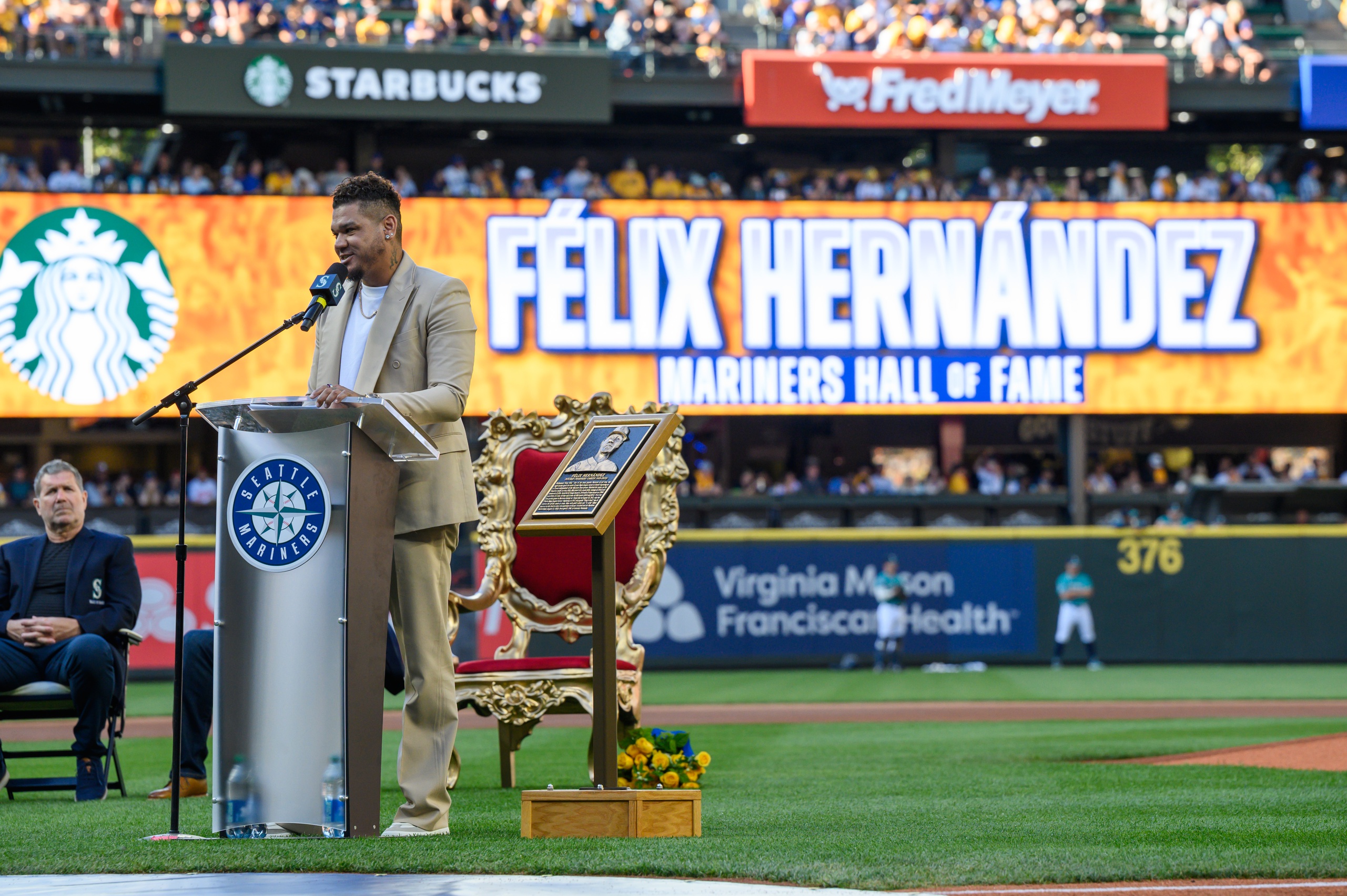 Aug 12, 2023; Seattle, Washington, USA; Former Seattle Mariner Felix Hernandez is inducted into the Mariners Hall of Fame prior to the game between the Seattle Mariners and the Baltimore Orioles at T-Mobile Park. Mandatory Credit: Steven Bisig-USA TODAY Sports