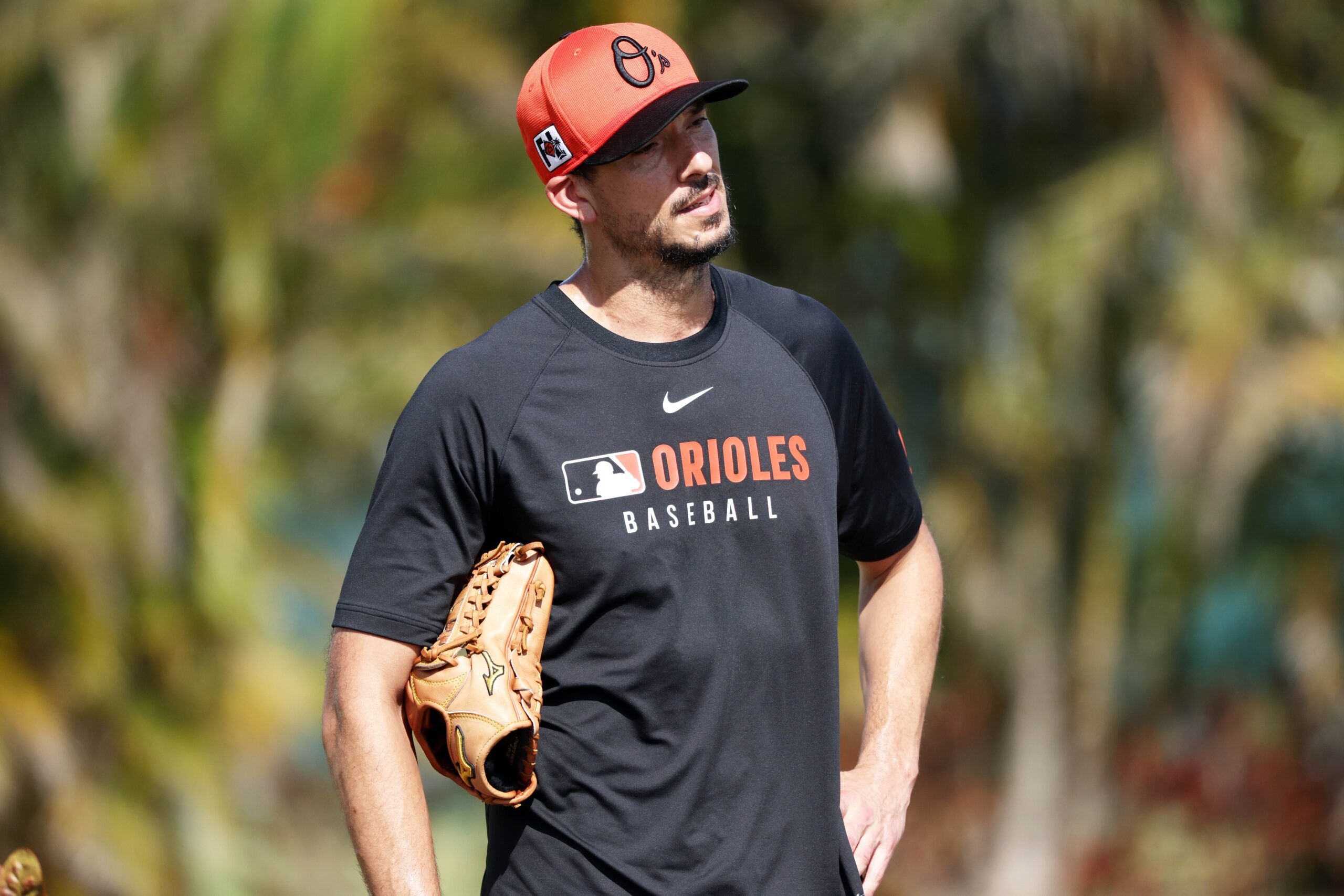 Feb 13, 2025; Sarasota, FL, USA; Baltimore Orioles pitcher Charlie Morton (50) during spring training workouts at Ed Smith Stadium. Mandatory Credit: Kim Klement Neitzel-Imagn Images