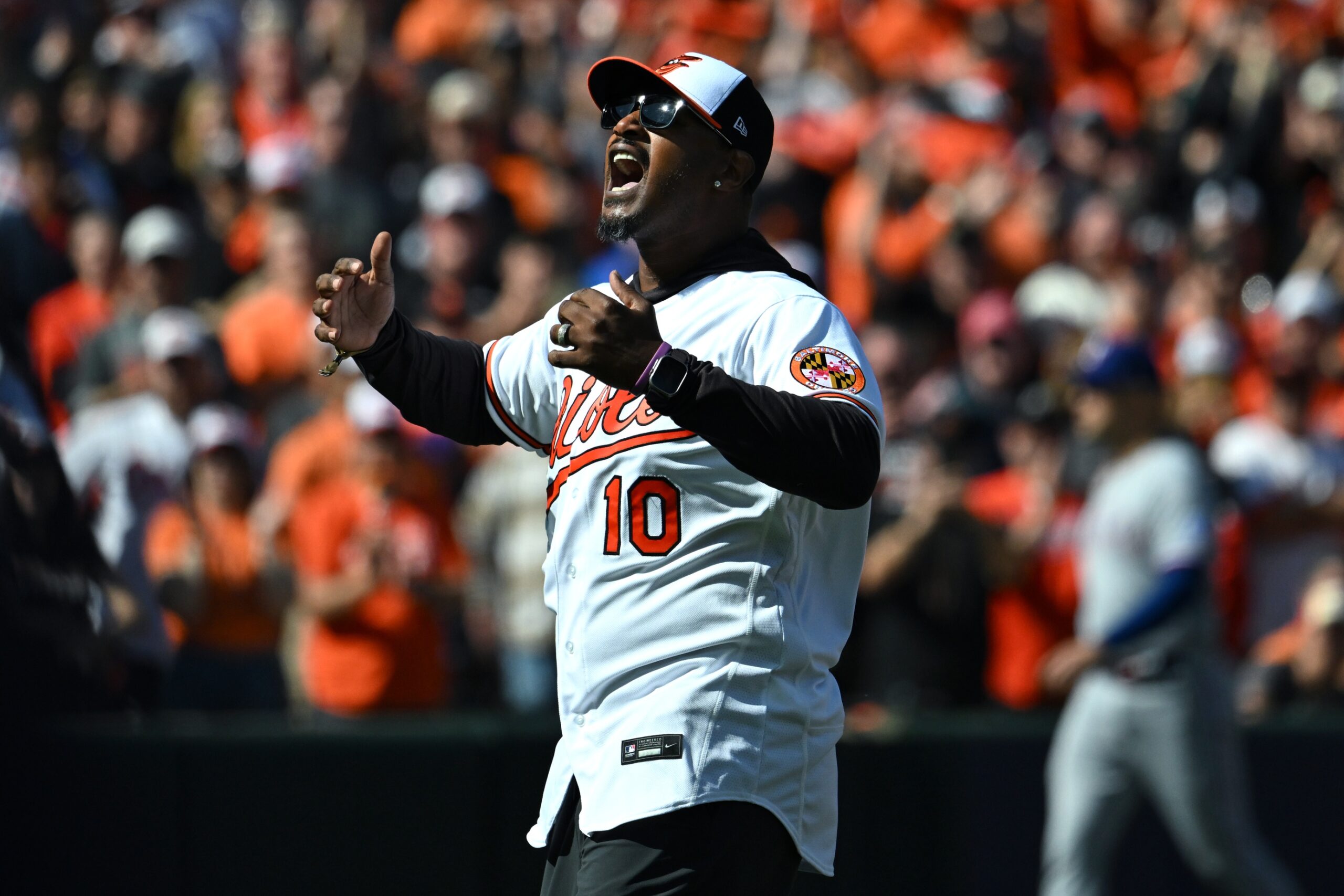 Oct 7, 2023; Baltimore, Maryland, USA; Former Baltimore Orioles player Adam Jones reacts after throwing out the ceremonial first pitch before game one of the ALDS for the 2023 MLB playoffs against the Texas Rangers at Oriole Park at Camden Yards. Mandatory Credit: Tommy Gilligan-USA TODAY Sports