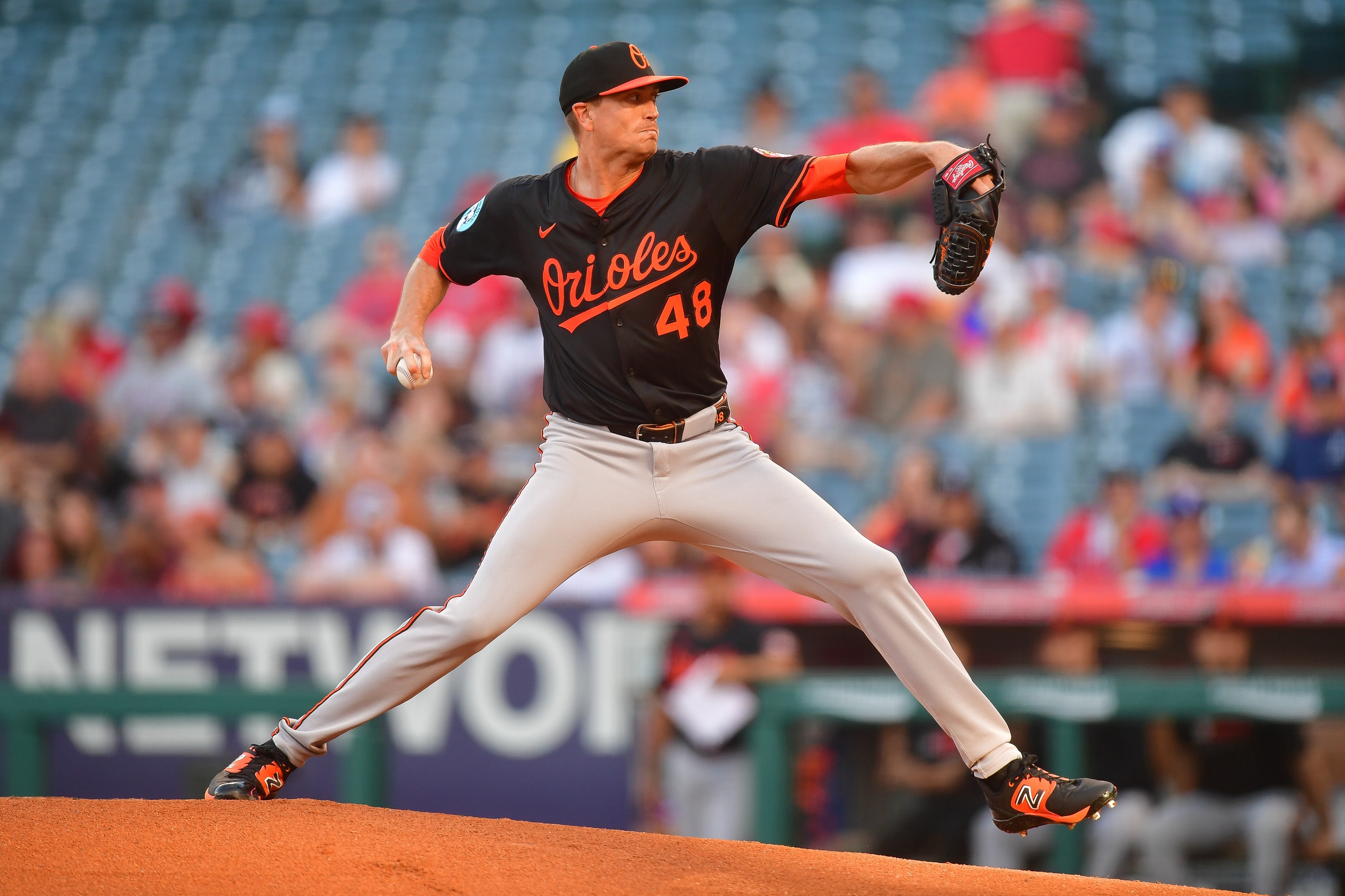 May 10, 2025; Anaheim, California, USA; Baltimore Orioles pitcher Kyle Gibson (48) throws against the Los Angeles Angels during the first inning at Angel Stadium. Mandatory Credit: Gary A. Vasquez-Imagn Images