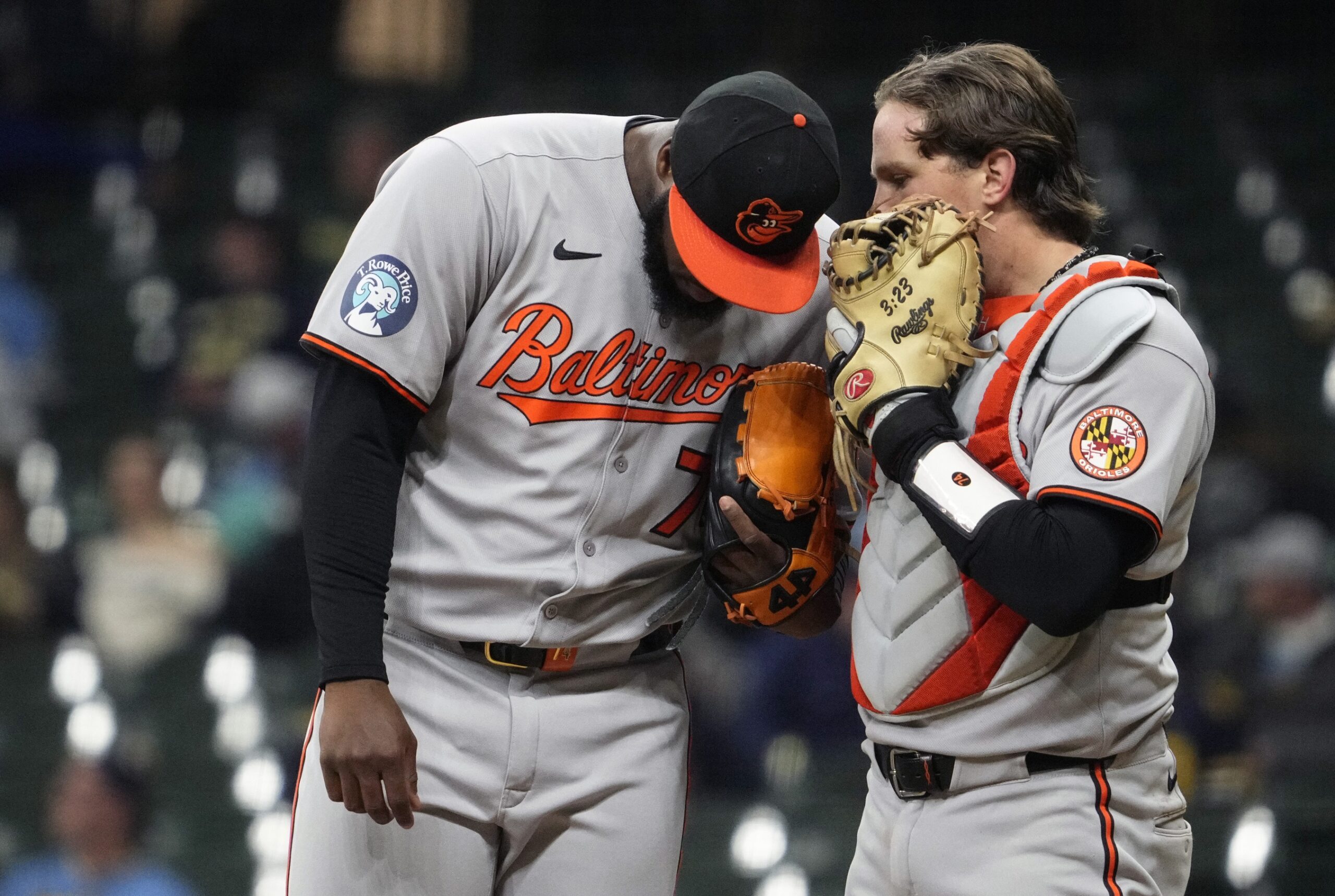 May 20, 2025; Milwaukee, Wisconsin, USA; Baltimore Orioles catcher Adley Rutschman (35) talks with pitcher Félix Bautista (74) on the mound against the Milwaukee Brewers in the eighth inning at American Family Field. Mandatory Credit: Michael McLoone-Imagn Images
