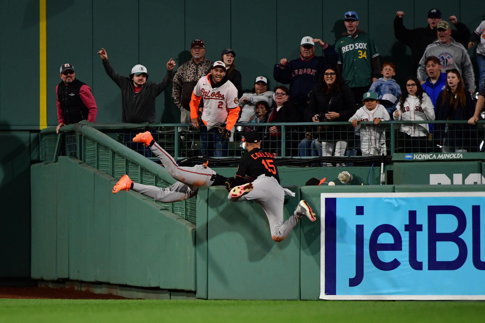 May 24, 2025; Boston, Massachusetts, USA; Baltimore Orioles centerfield Jorge Mateo (3) dives for a home run ball hit by Boston Red Sox first baseman Abraham Toro (29) (not pictured) while right fielder Dylan Carlson (15) looks on during the ninth inning at Fenway Park. Mandatory Credit: Bob DeChiara-Imagn Images