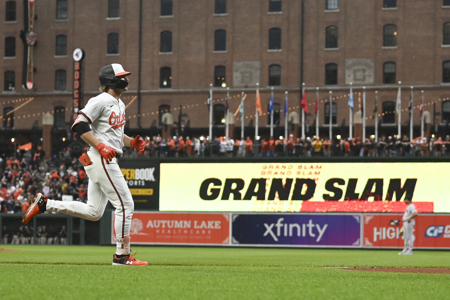 May 29, 2024; Baltimore, Maryland, USA; Baltimore Orioles shortstop Gunnar Henderson (2) runs home after hitting a second inning gran slam against the Boston Red Sox at Oriole Park at Camden Yards. Mandatory Credit: Tommy Gilligan-USA TODAY Sports