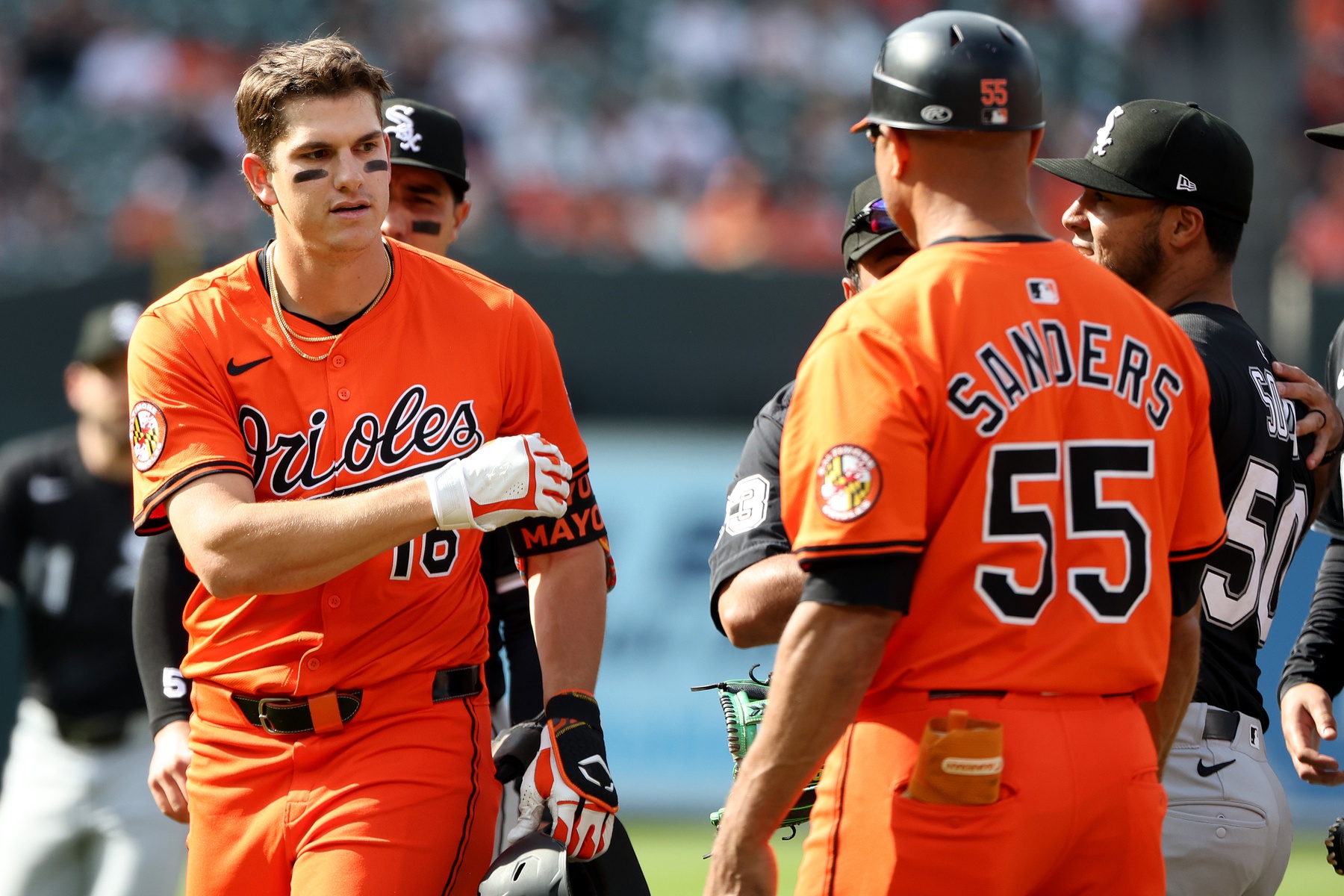 May 31, 2025; Baltimore, Maryland, USA; Baltimore Orioles third baseman Coby Mayo (16) argues with Chicago White Sox second baseman Lenyn Sosa (50) during the fifth inning at Oriole Park at Camden Yards. Mandatory Credit: Daniel Kucin Jr.-Imagn Images