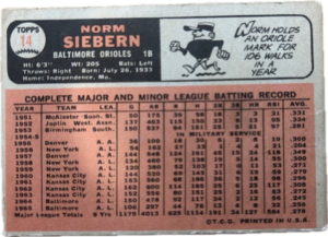 One of Bauer’s first moves in Baltimore was to OK a trade for Siebern, who’d been his teammate on the Yankees in the ‘50s and also on the Kansas City A’s in the early ‘60s. (Bauer and Siebern both went from first to worst, i.e., from the Yankees to the A’s, in the trade that brought Roger Maris to the Yankees.)
