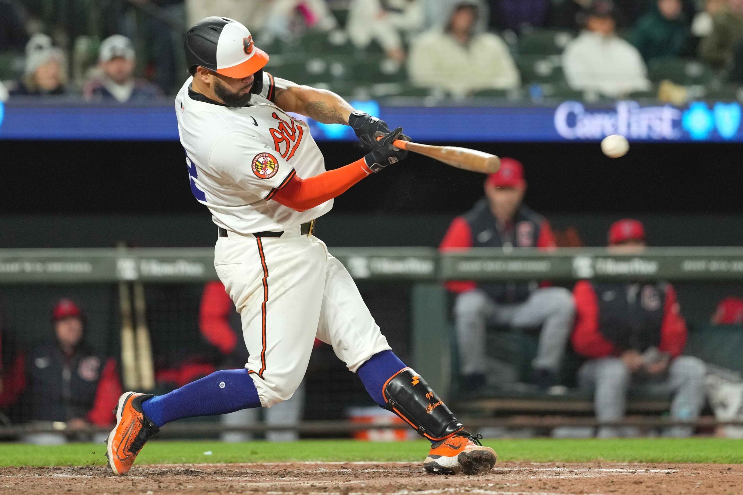 Apr 15, 2025; Baltimore, Maryland, USA; Baltimore Orioles catcher Gary Sanchez (42) drives in a run during the eight inning against the Cleveland Guardians at Oriole Park at Camden Yards. All players wore (42) to commemorate Jackie Robinson Day. Mandatory Credit: Mitch Stringer-Imagn Images