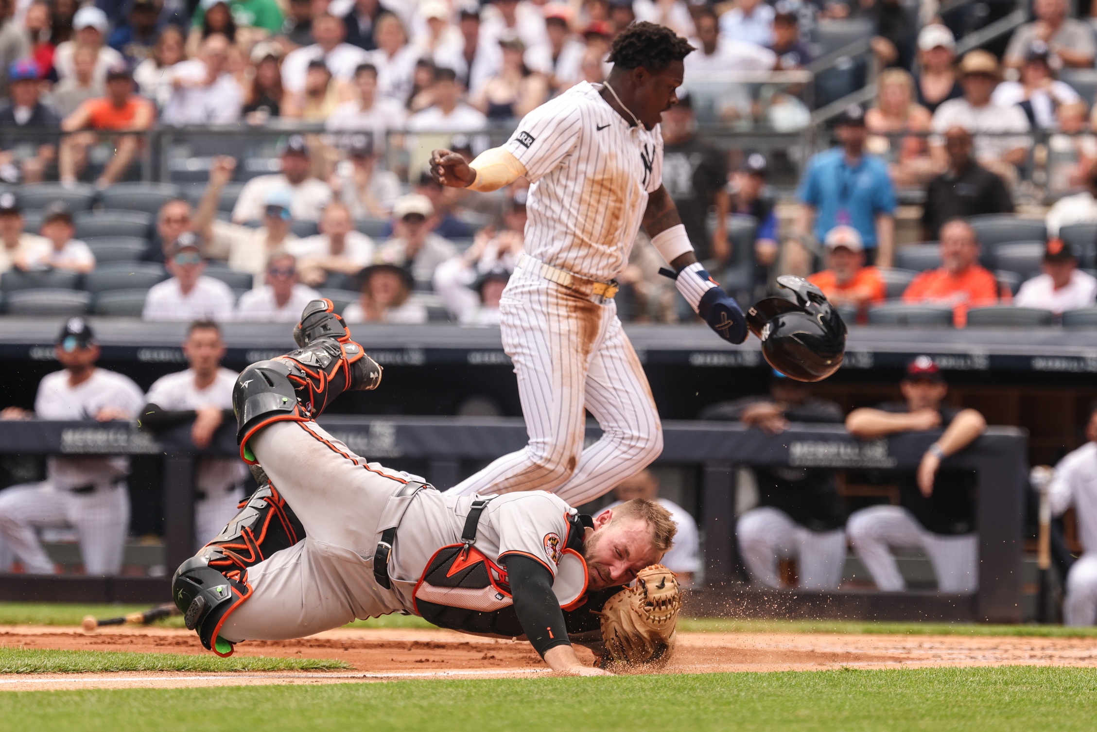 Jun 22, 2025; Bronx, New York, USA; New York Yankees second baseman Jazz Chisholm Jr. (13) collides with Baltimore Orioles catcher Maverick Handley (98) at home plate during the second inning at Yankee Stadium. Mandatory Credit: Vincent Carchietta-Imagn Images