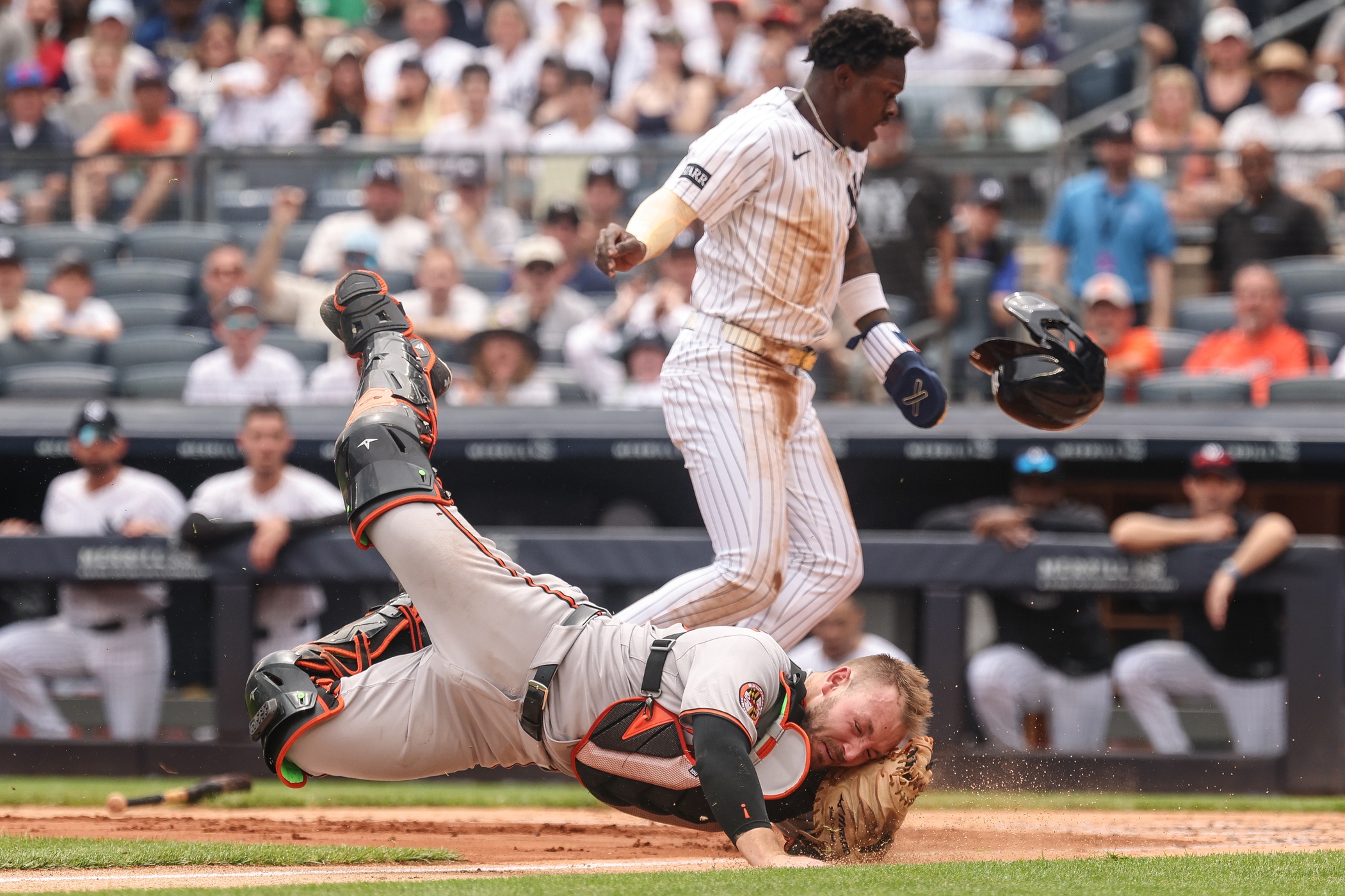 Jun 22, 2025; Bronx, New York, USA; Baltimore Orioles catcher Maverick Handley (98) lands after a collation with New York Yankees second baseman Jazz Chisholm Jr. (13) at home plate during the first inning at Yankee Stadium. Mandatory Credit: Vincent Carchietta-Imagn Images