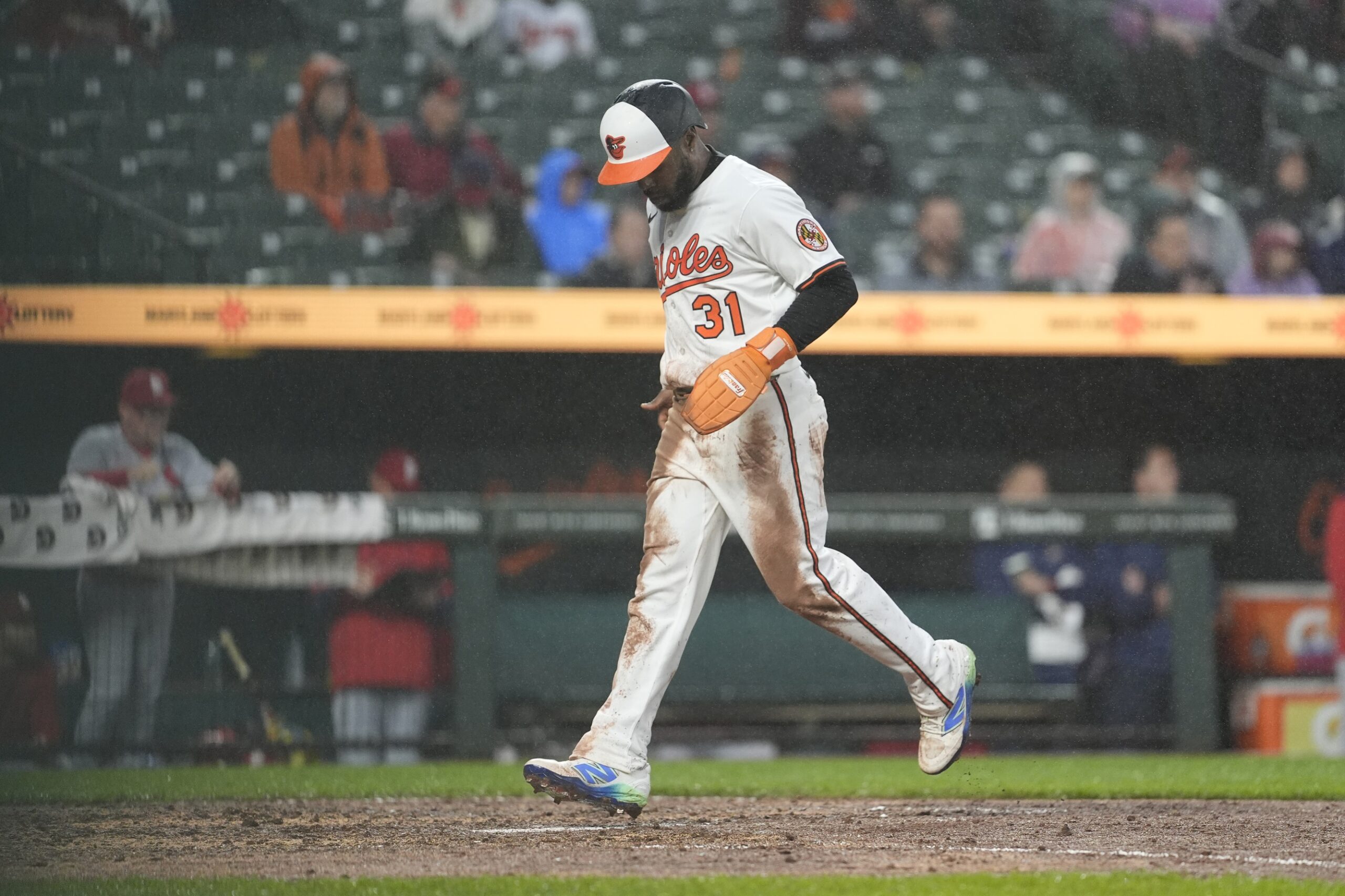 May 28, 2025; Baltimore, Maryland, USA; Baltimore Orioles center fielder Cedric Mullins (31) scores a run on Baltimore Orioles center fielder Dylan Carlson (15) (not pictured) RBI single against the St. Louis Cardinals during the fourth inning at Oriole Park at Camden Yards. Mandatory Credit: Gregory Fisher-Imagn Images